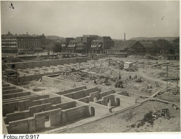 bygge; byggnadsarbete; postväsen; exteriör; dag; järnvägsstation; hotell; torg