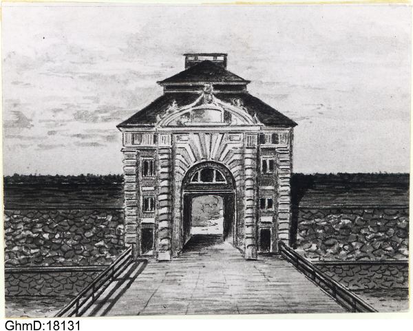 Drottningporten utifrån. Akvarellteckning efter Suecia-verket.