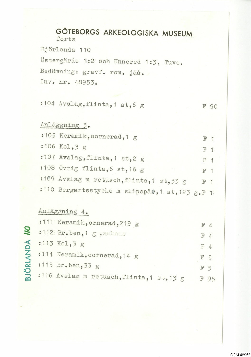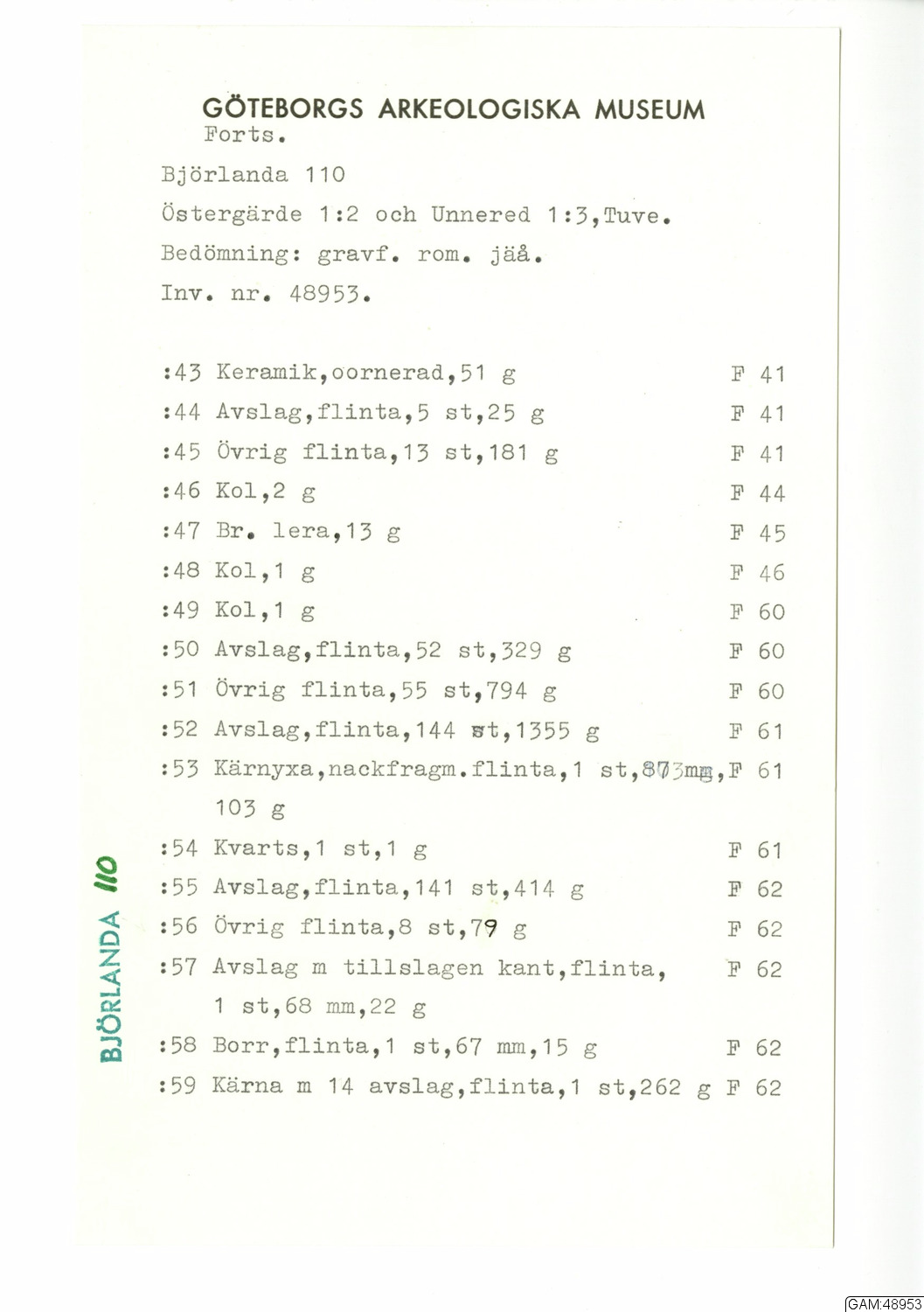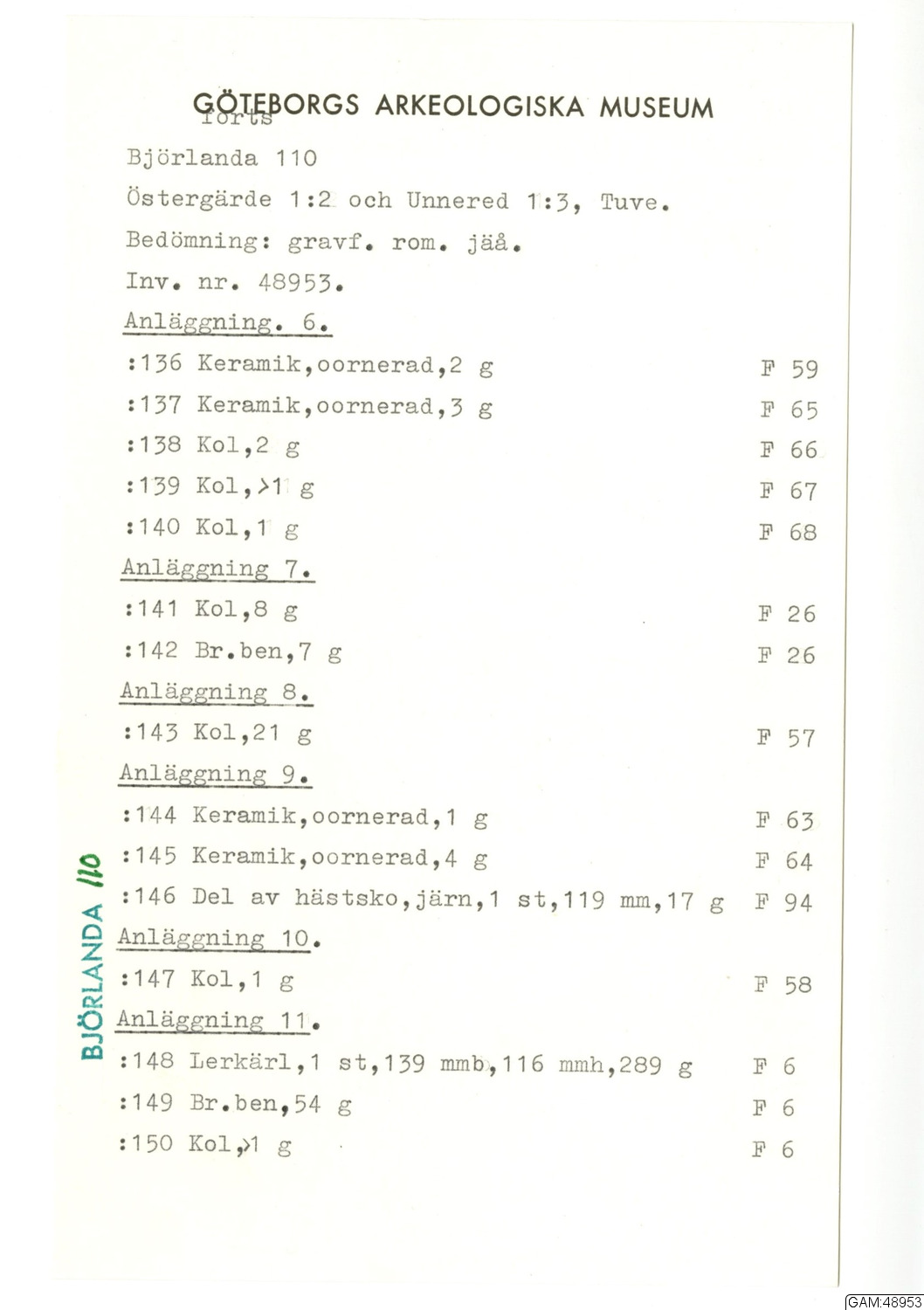GAM:48953 :: utgrävningar, utgrävning, slutundersökning [fältark]
