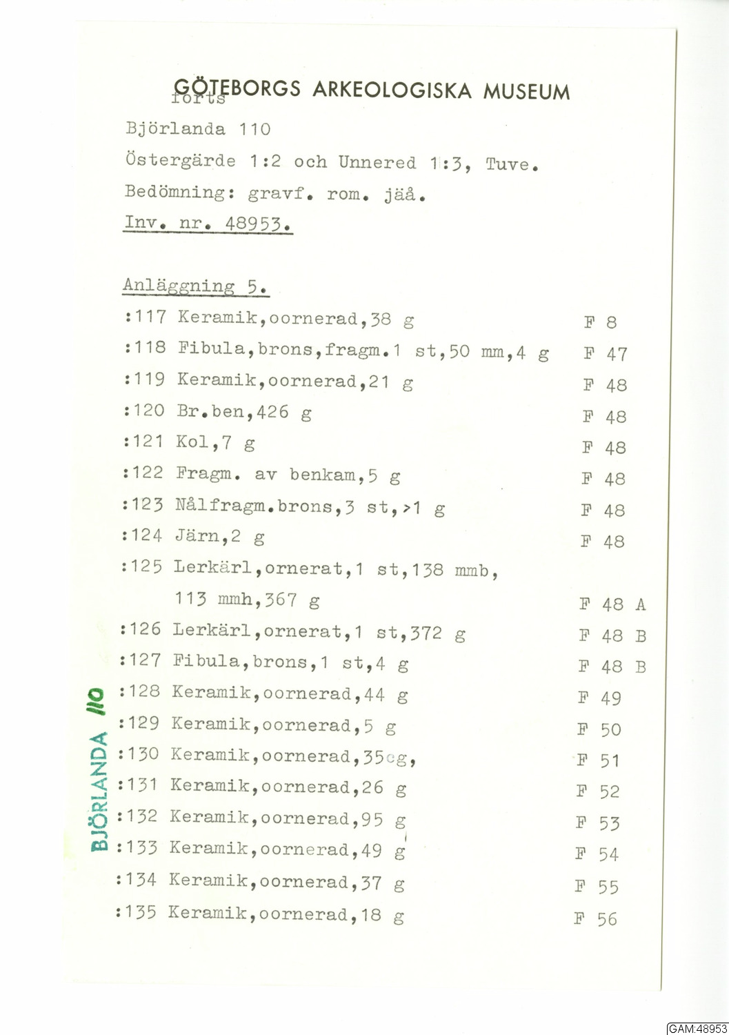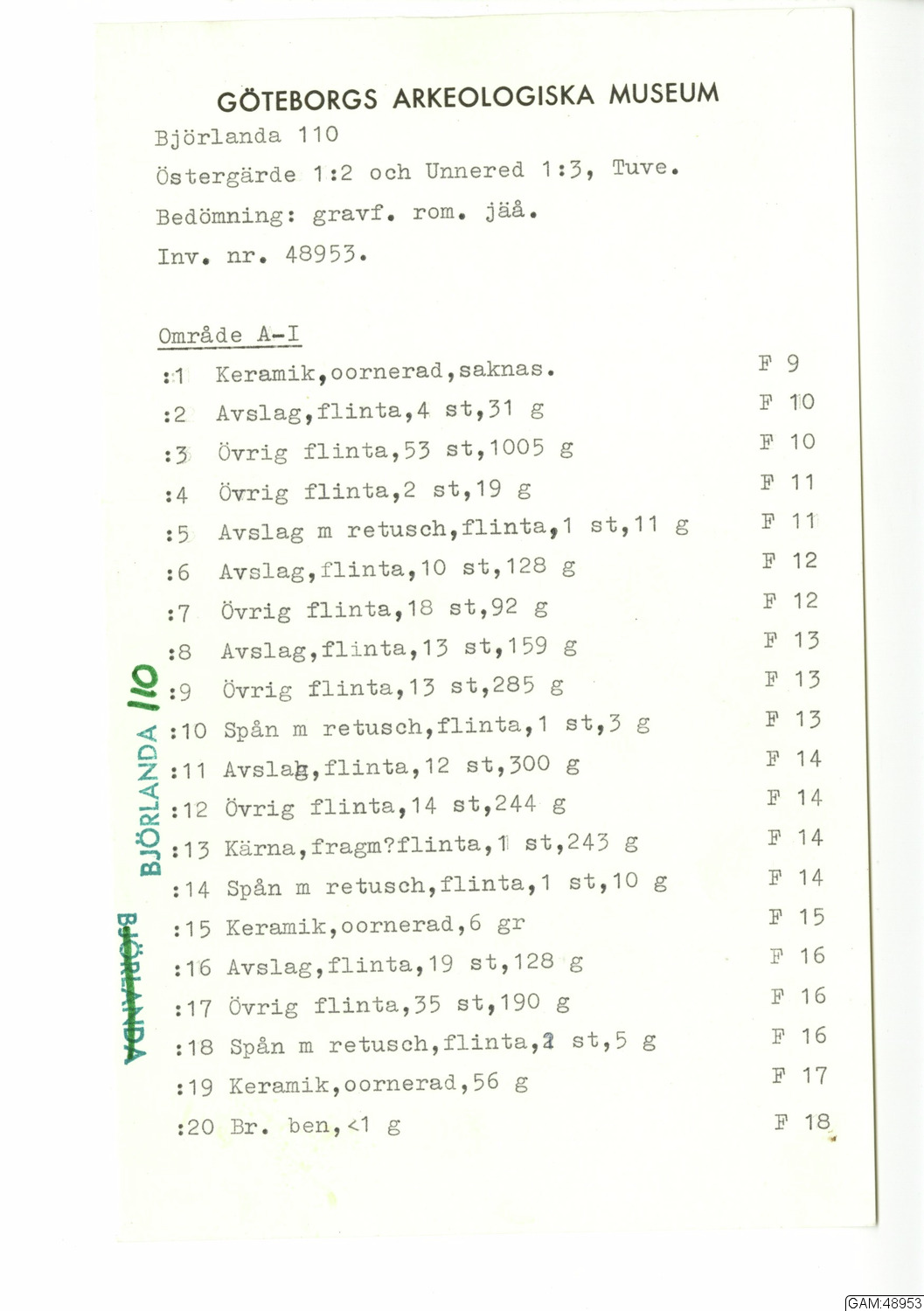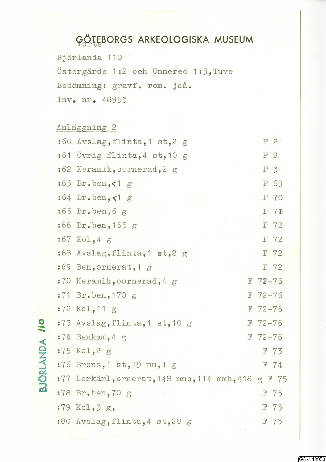 GAM:48953 :: utgrävningar, utgrävning, slutundersökning [fältark]