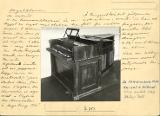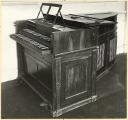 Klaviorganum; under hammarklaveret är inbyggd en orgel med slutna träpipor. Två klaviaturer, den övre för pianot, den undre för orgeln. Fem oktaver i varje klaviatur. Nedre tangenter svarta, övertangenter vita. Singerad inuti på en papperslapp (inom en kartusch)