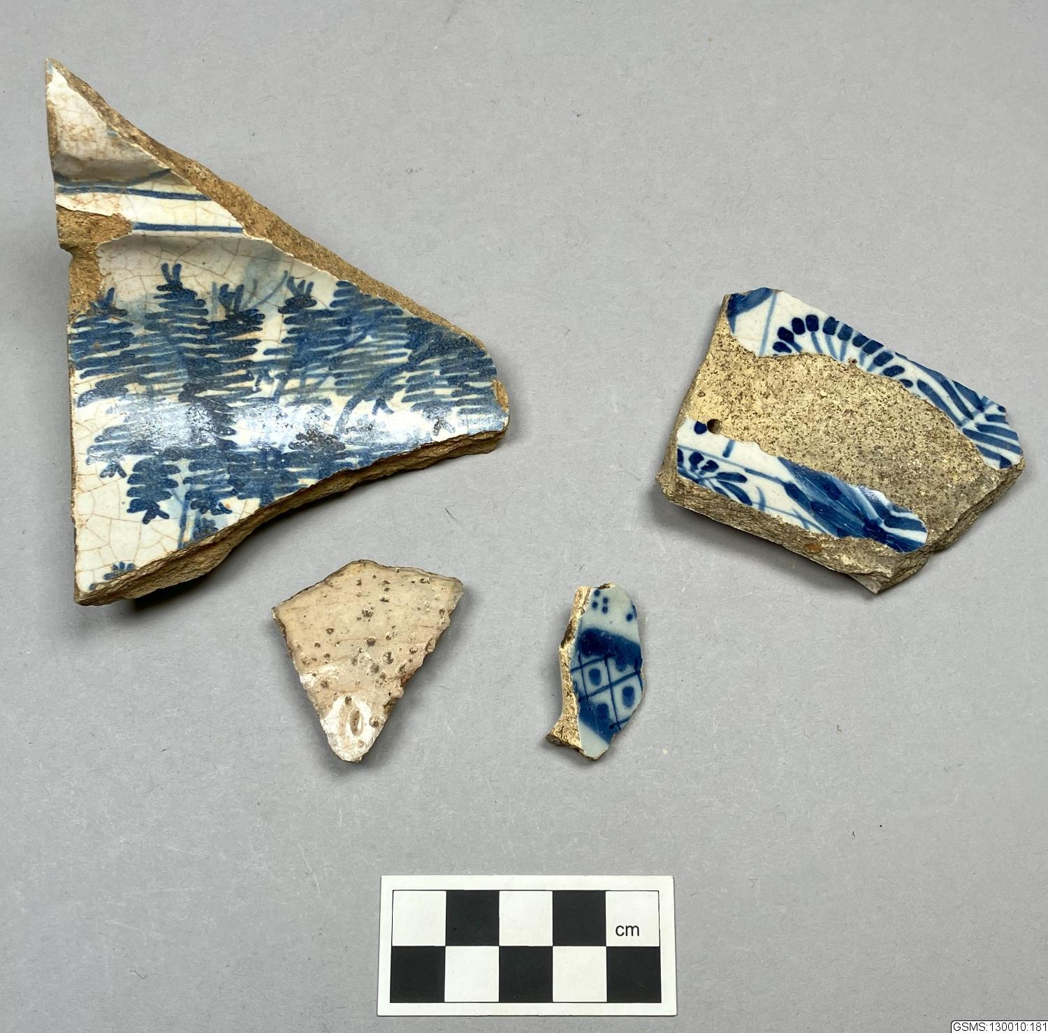 Blåvit fajans, fragment; fajans samt kakelugnskakel (troligtvis)
