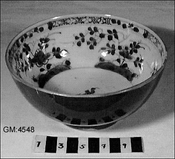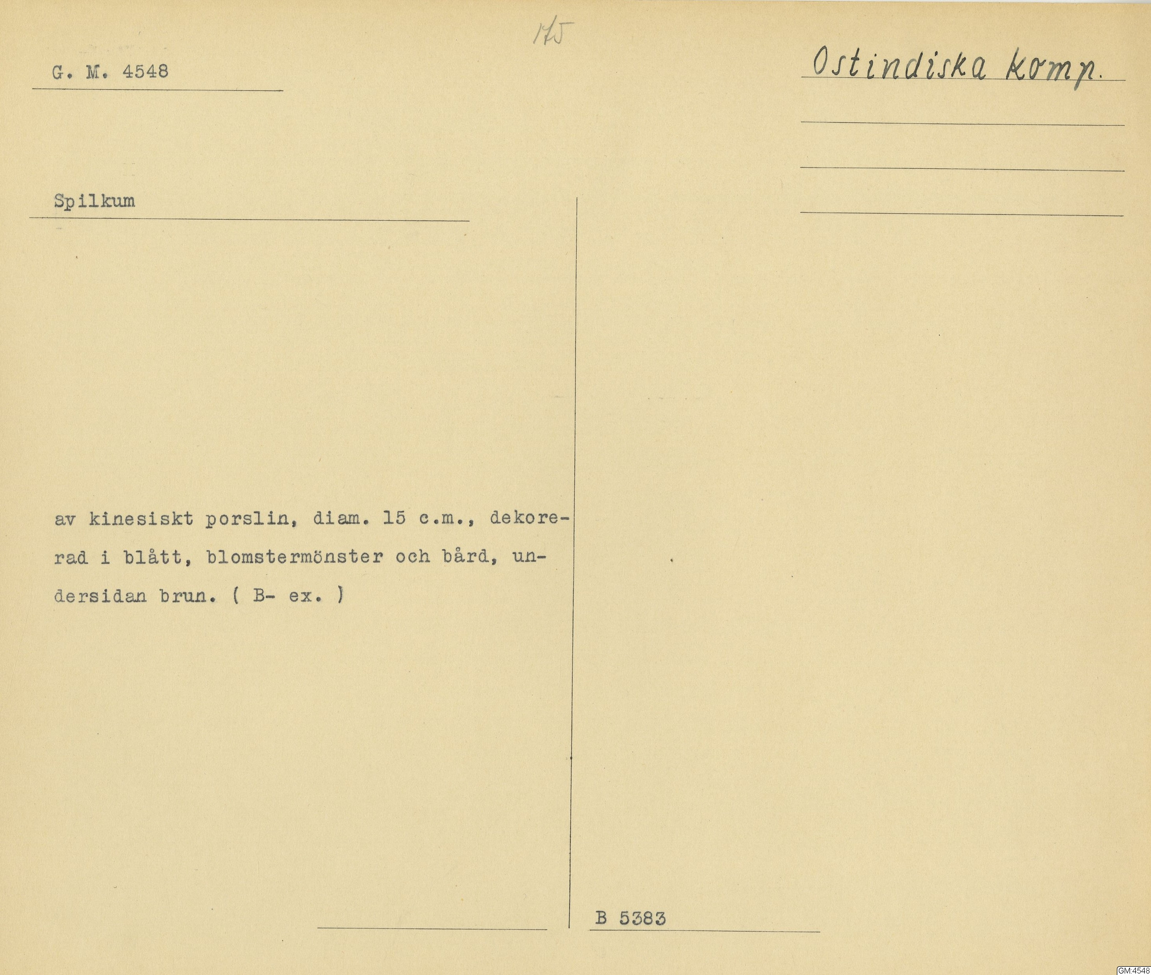 GM katalogkort 175. 18E Porslin Ostindiskt 5. Karott, terrin, muggar, skål mm