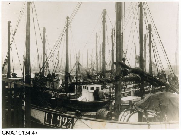 - "Fiskeflottan samlad i fiskhamnen en tidig morgonstund."