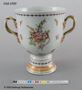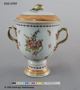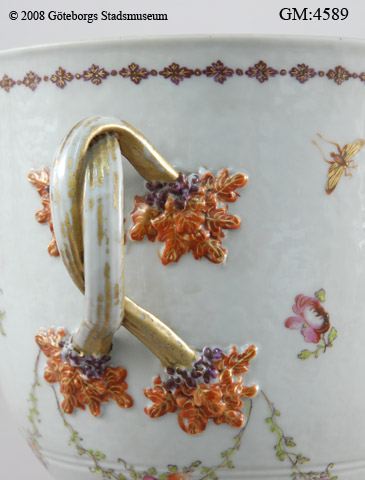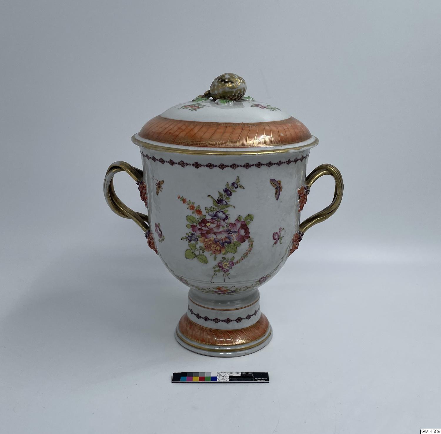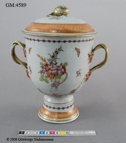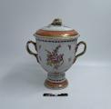 Vas med lock, vitt kinesiskt porslin; blomsterkvistar och girlander, bårder i rött och guld, förgyllda hänklar.
