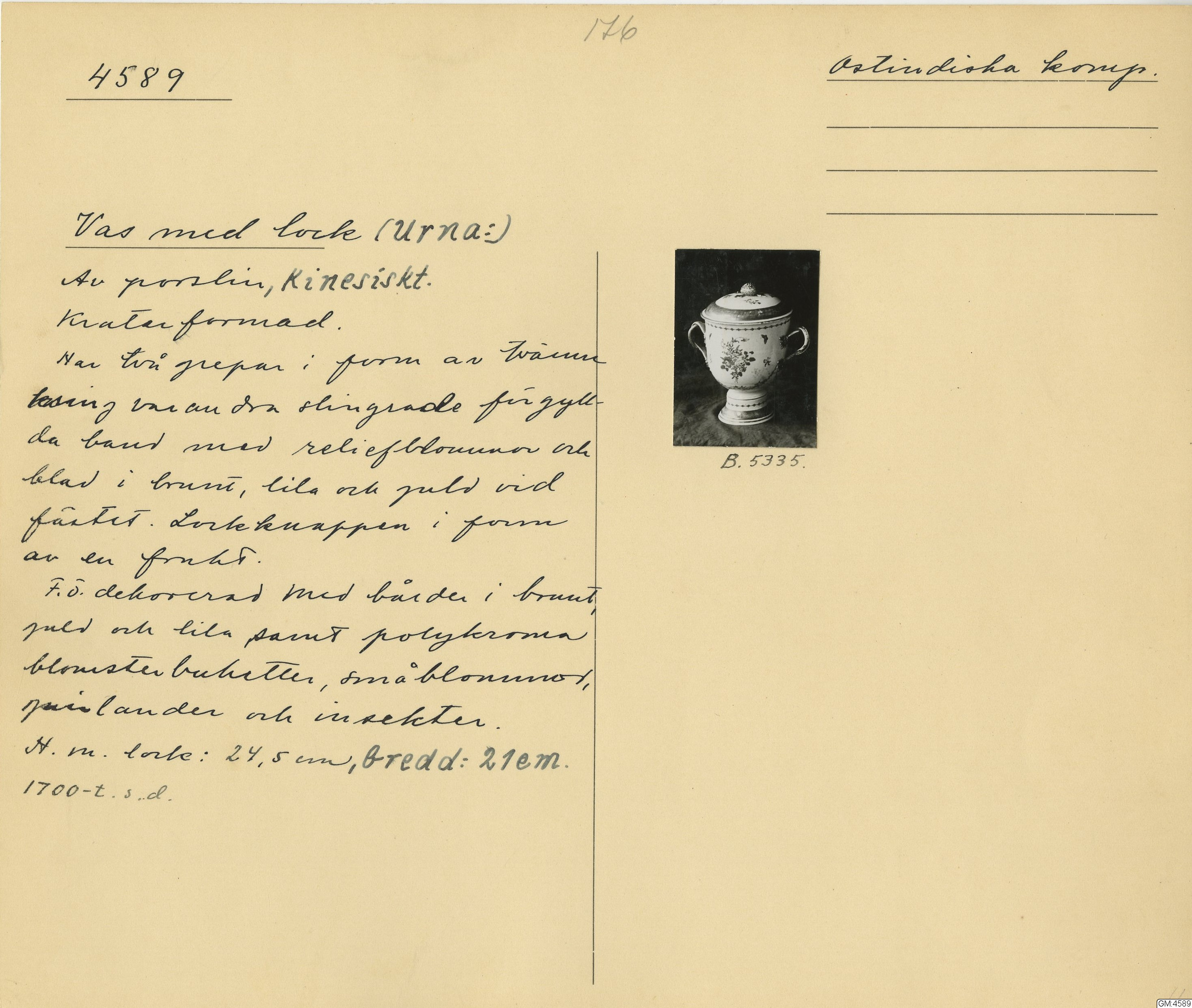 GM katalogkort 176. 18E Porslin Ostindisk 6. Krukor, urnor, vaser, figuriner