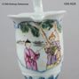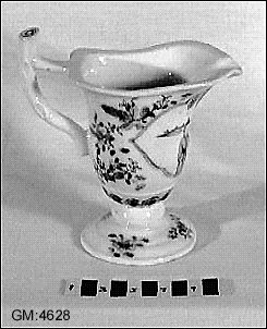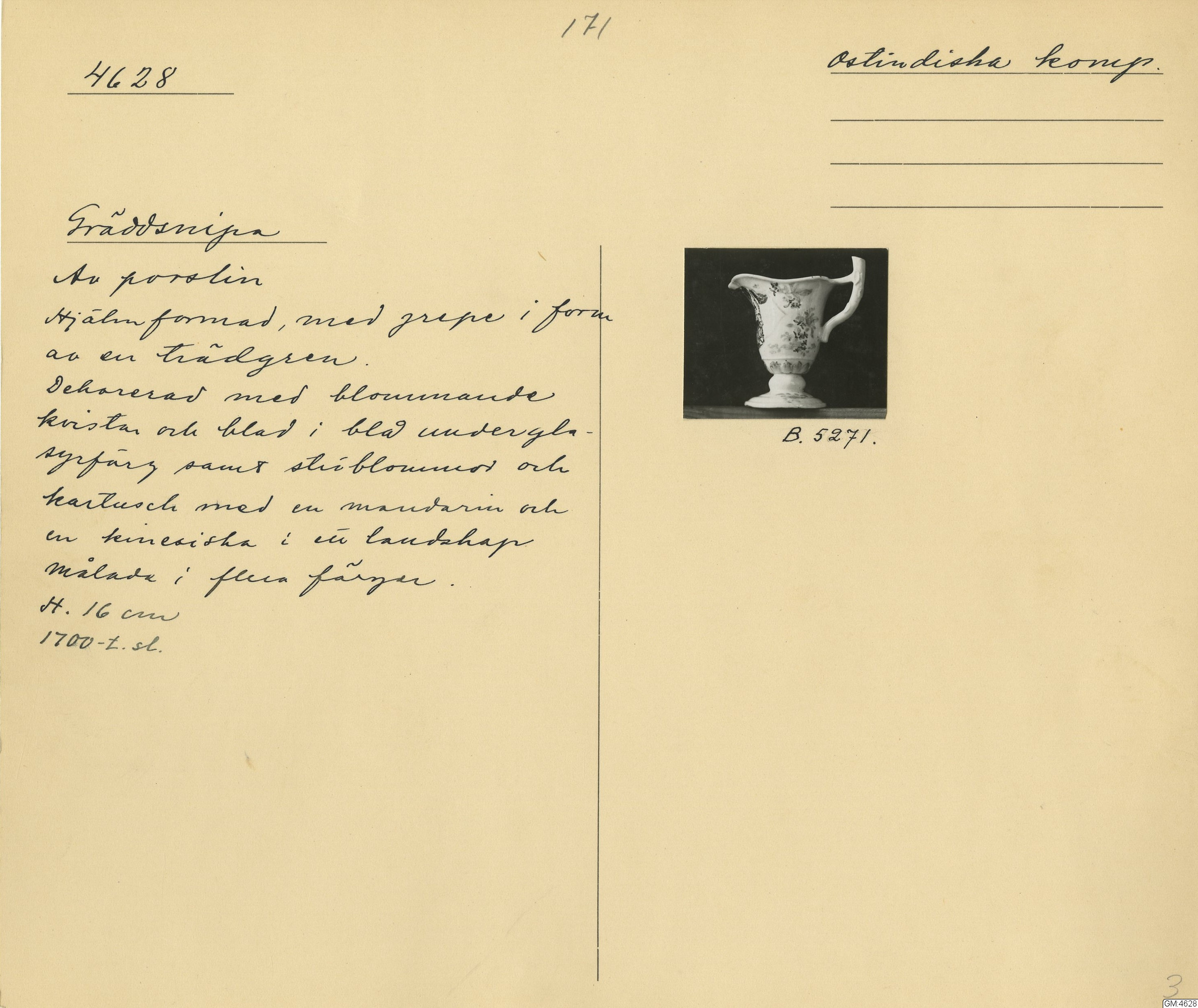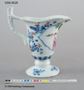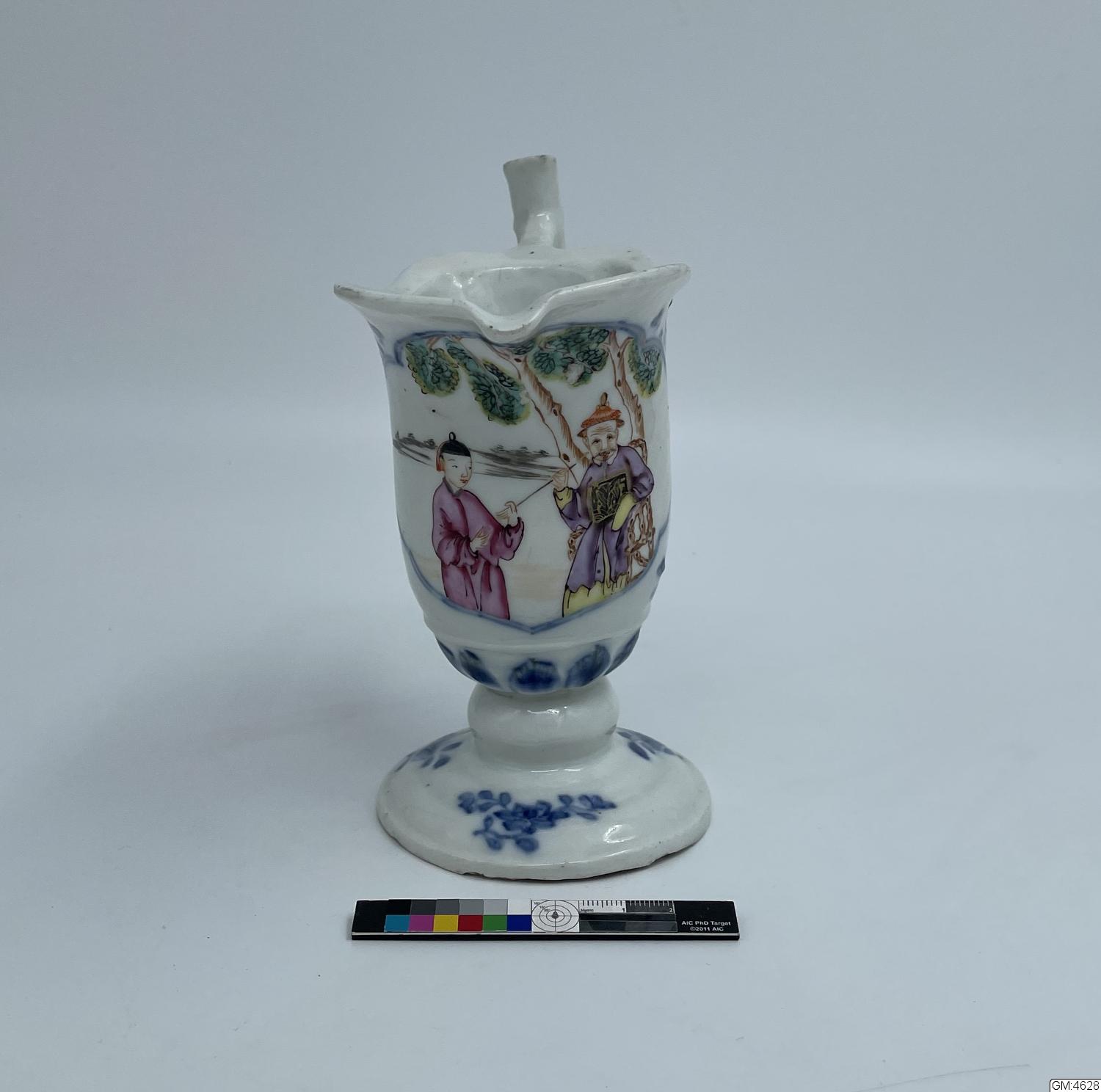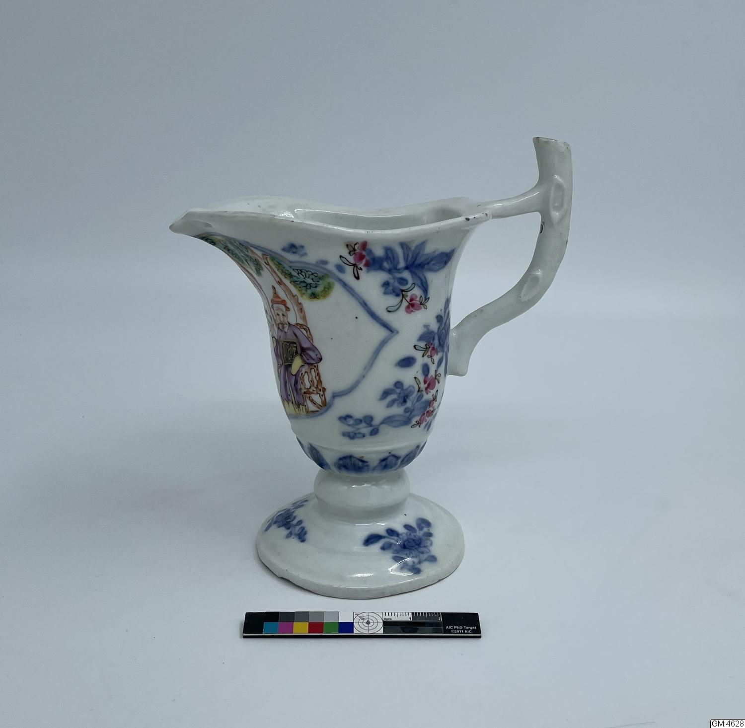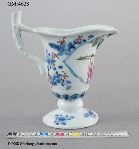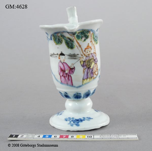 - Gräddkanna av kinesiskt vitt porslin; dekorerad i blått, rött och grönt; blomstermönster samt två manliga figurer i kinesiska kläder.