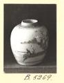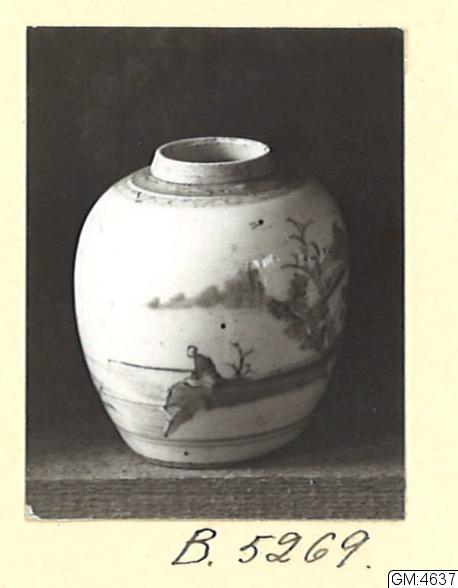 "Kruka. Av porslin. Äggformad, utan lock. Dekorerad i blå underglasfärg med pagodlandskap samt en bandbård i flätmönster upptill."