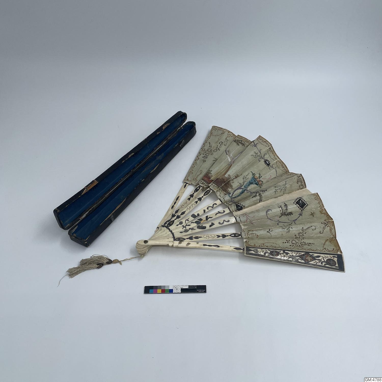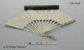 - Veckad solfjäder med spröt i elfenben belagda med metalldekor. Överdrag i bemålat ljust siden dekorerad med paljetter. Baksidan är ej synlig pga att den sekundärt är helfodrad med papper. I nedre änden sitter en ljus dubbel textiltofs. Till solfjädern hör en ask i svart kartong fodrad med blått papper. Asken stängs med två metallhakar som vid besiktningen är delvis trasiga. Mått på asken Längd:27,9cm, bredd:3,5cm, tjocklek:3,2cm. /aa