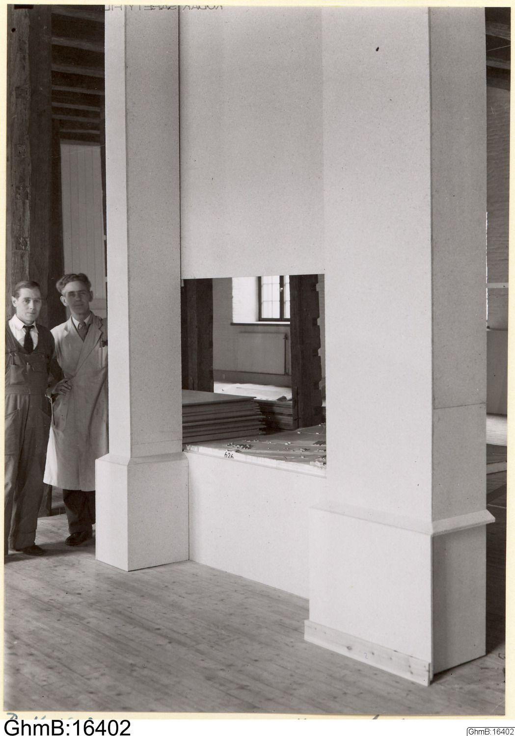 Från inredningsarbeterna för överflyttning av de Göteborgshistoriska samlingarna: pelare inklädda med masonite.