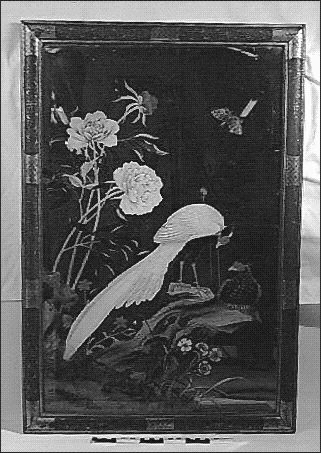 - Kinesisk spegelmålning från 1700-talets mitt. Motiv: 3 pioner (2 vita, 1 röd), 2 st fåglar som står på en sten och fjäril som flyger i luften. Ramen är brun och guldfärgad. Tillverkad i Kina efter beställning av Jean Abraham Grill, som i ett brev till Jacob Hahr i Kanton daterat 14/11 1770 skriver att han sänder en glasruta som han önskar skall "lämnas Ava eller dess bror Apou i kom (kommission) att låta måla med en vit fasan och dess höna på, sittande på grottverk med några blommor kring".