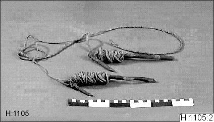 Tre (bilden visar 2) spinnkrokar med påbörjat rep. På var och en av krokarna är ett snott garn uppvirat. Dessa är hoptvinnade till en del och bildar således början till en tregarnslina.