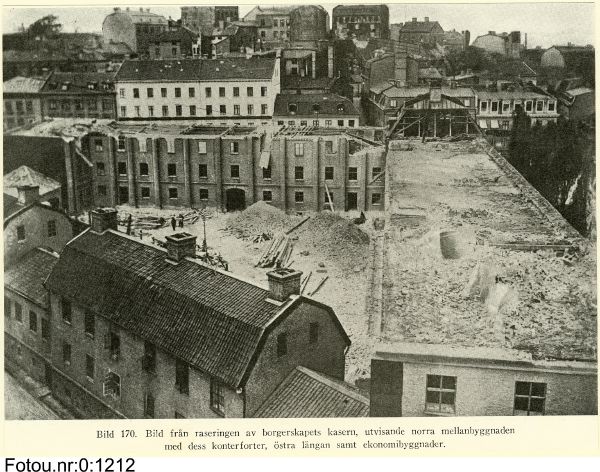 Bild 170. Bild från raseringen av borgerskapets kasern, utvisande norra mellanbyggnaden med dess konterforter, östra längan samt ekonomibyggnader
