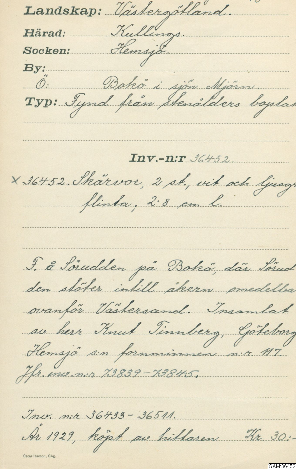 GAM katalogkort : V A : Västergötland : Kullings härad : Stenåldern : Boplatser