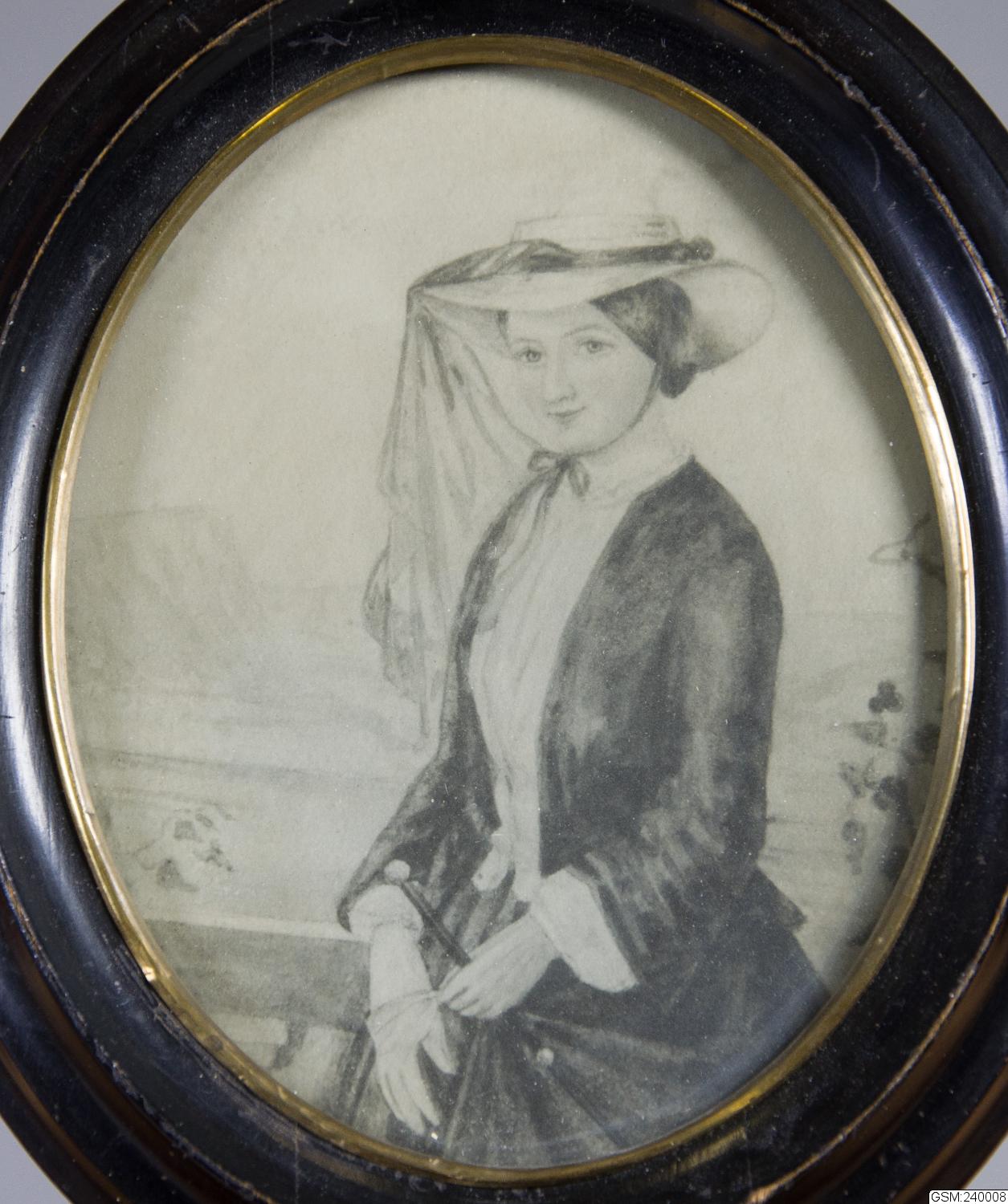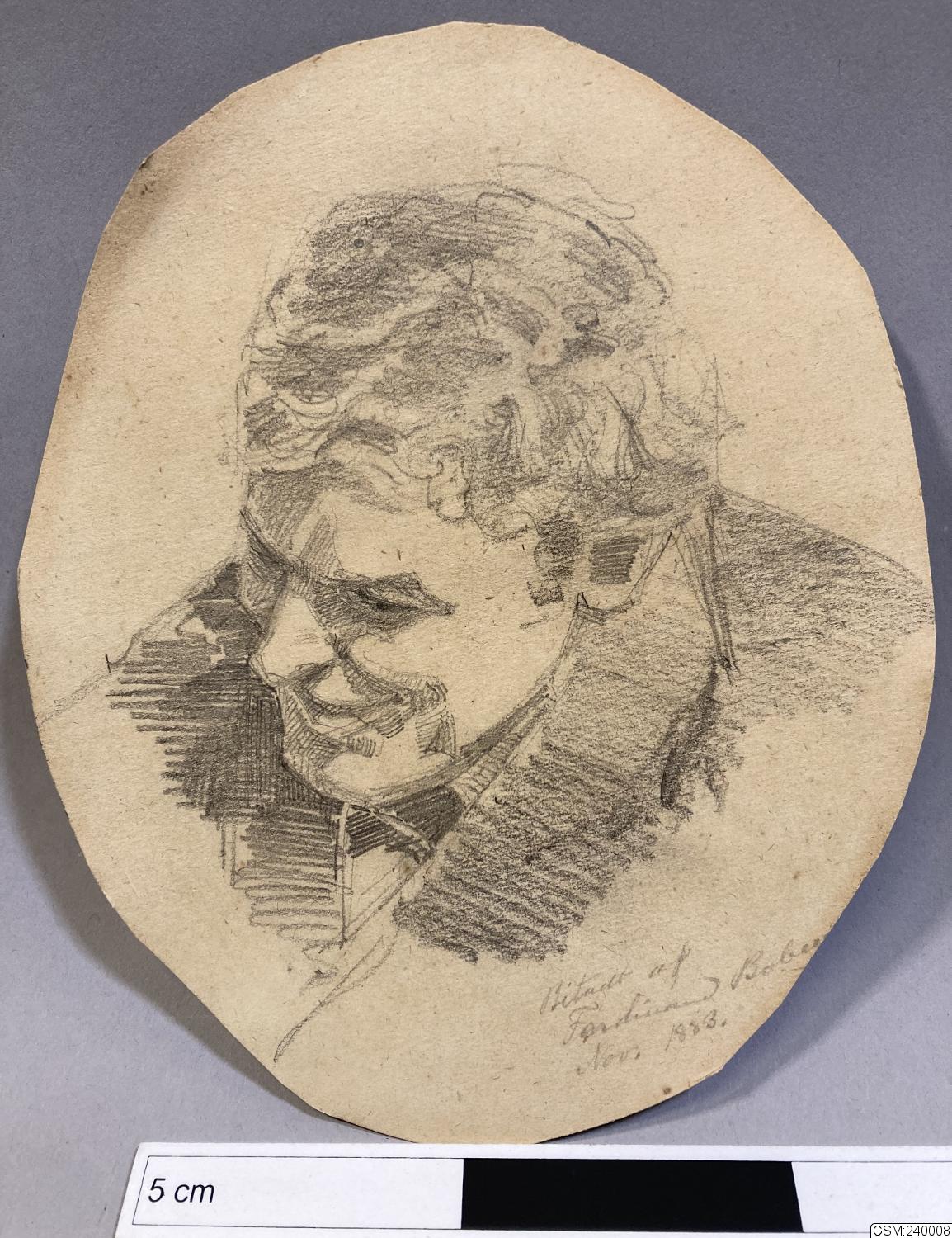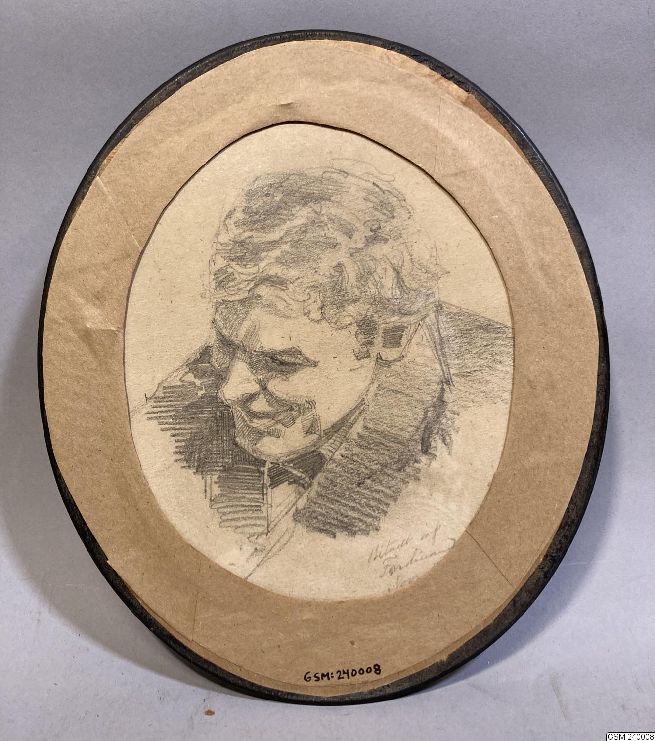 - Svartvitt fotografi av målat porträtt. Tyvärr är det okänt vem porträttet föreställer. Som bakstyckesskydd användes en originalteckning av Ferdinand Boberg dat. Nov. 1883 föreställande en leende herre.