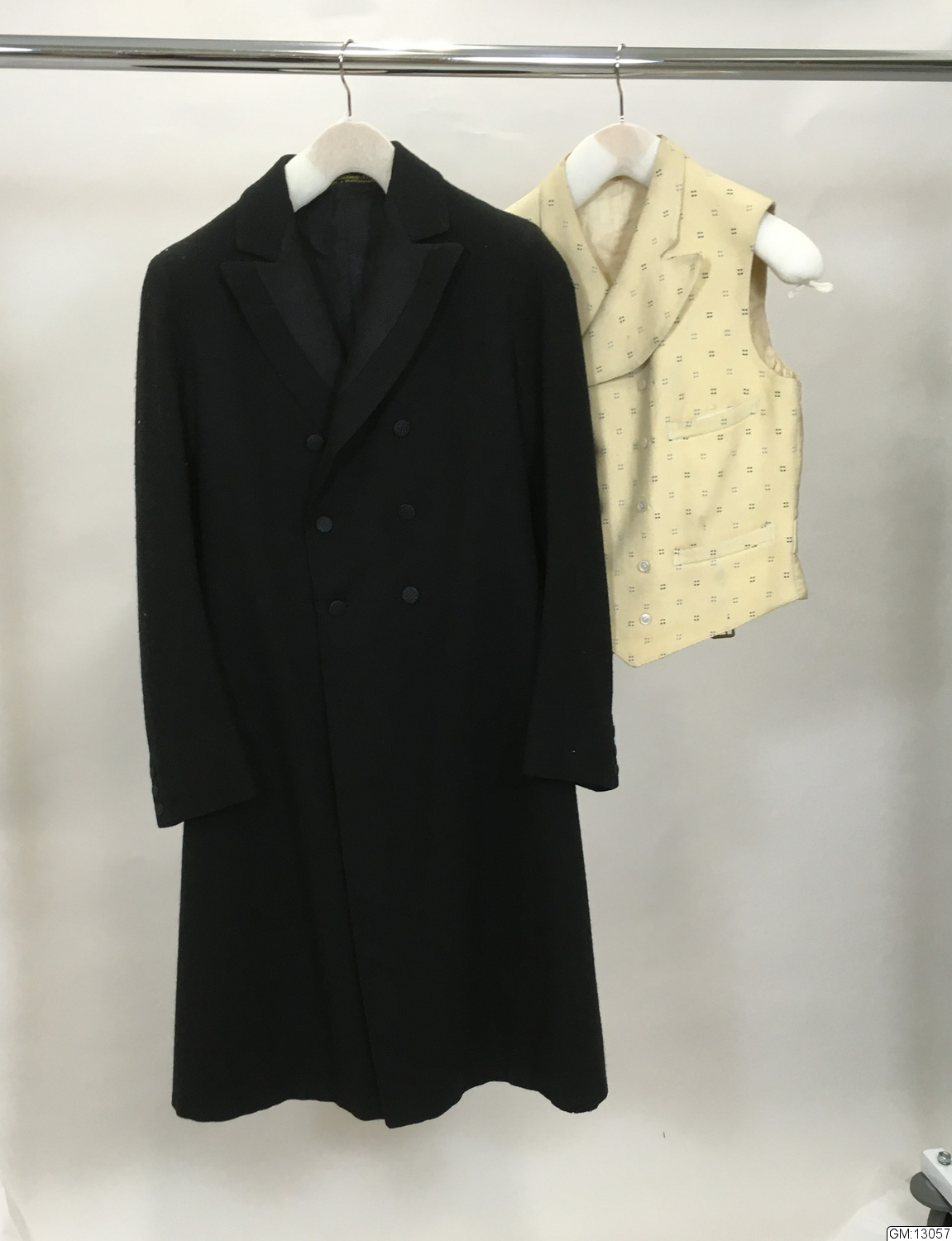 - Redingote i svart ylle. Tillhörande vit väst med mönster av mörka prickar, vit kraglös skjorta, vit stärkkrage och halsduk. Sydd i nov. 1904