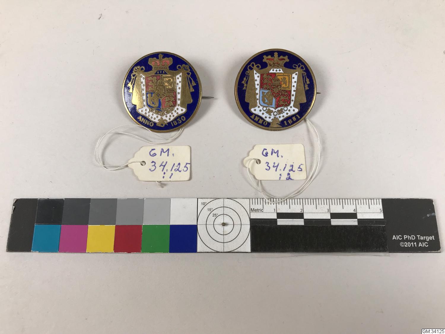 Två runda emaljerade broscher i rött, blått, vitt och guld. Riksvapen (?) mot blå bakgrund. Märkta Anno 1830 resp 1851.