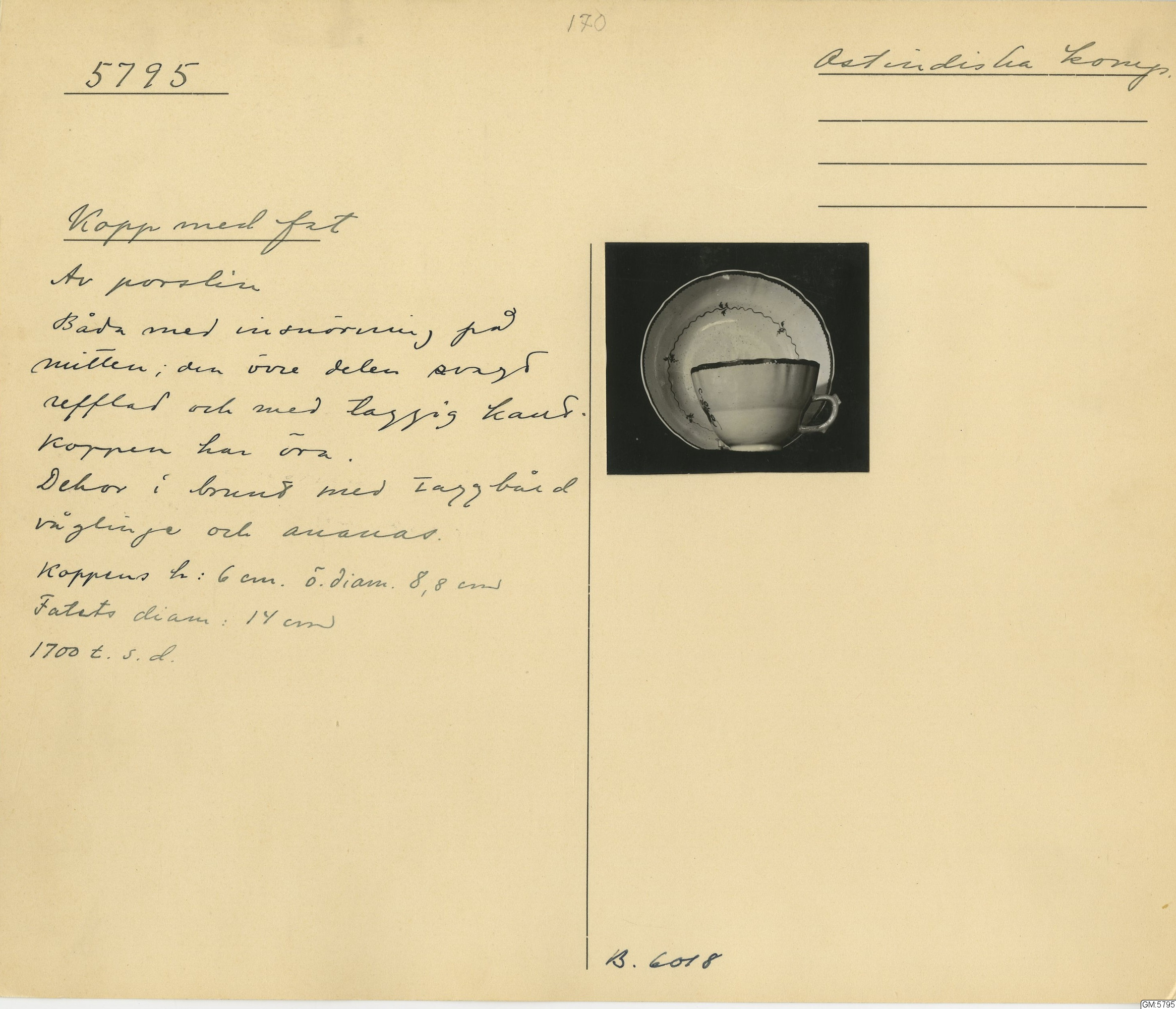 GM katalogkort 170. 18E. Porslin Ostindiskt 1. Thé mm 1. Kannor, koppar, fat