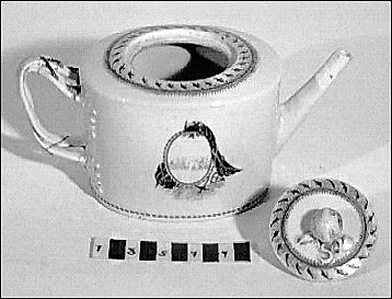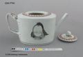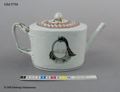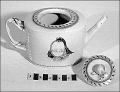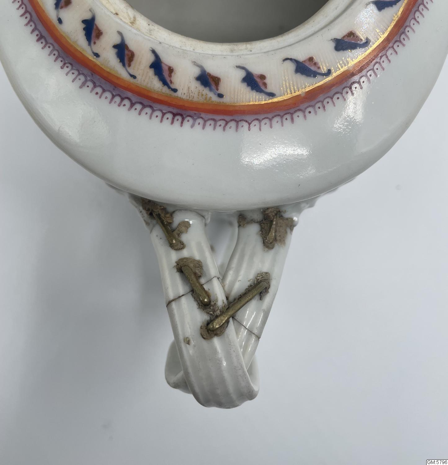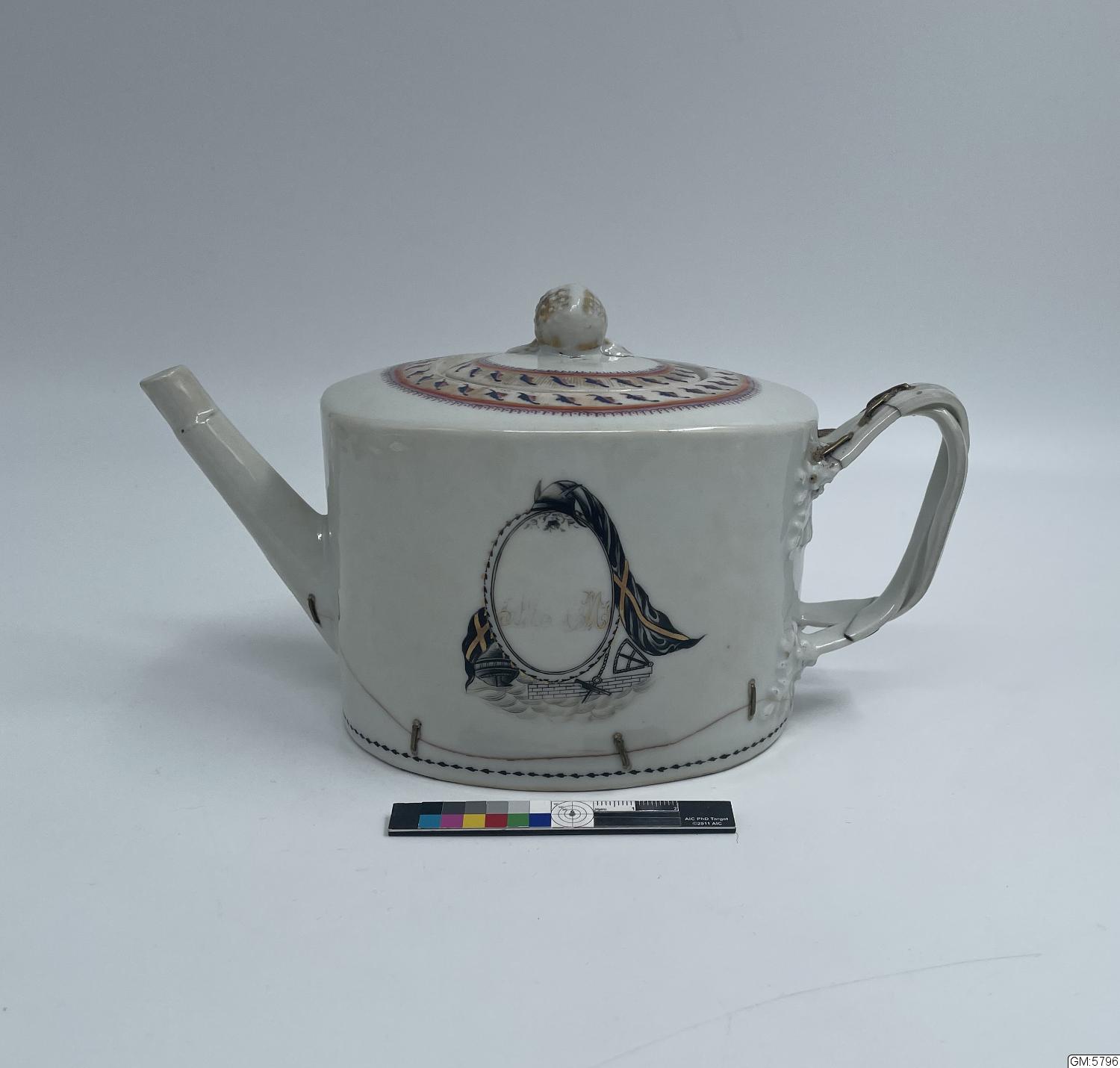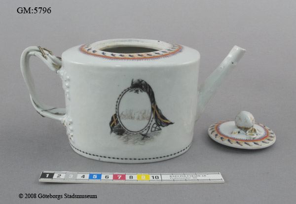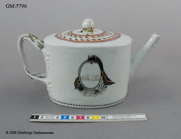 Tekanna med lock i kinesiskt porslin (lagad) dekorerad, monogram MM och CM i kartusch i svart och guld.