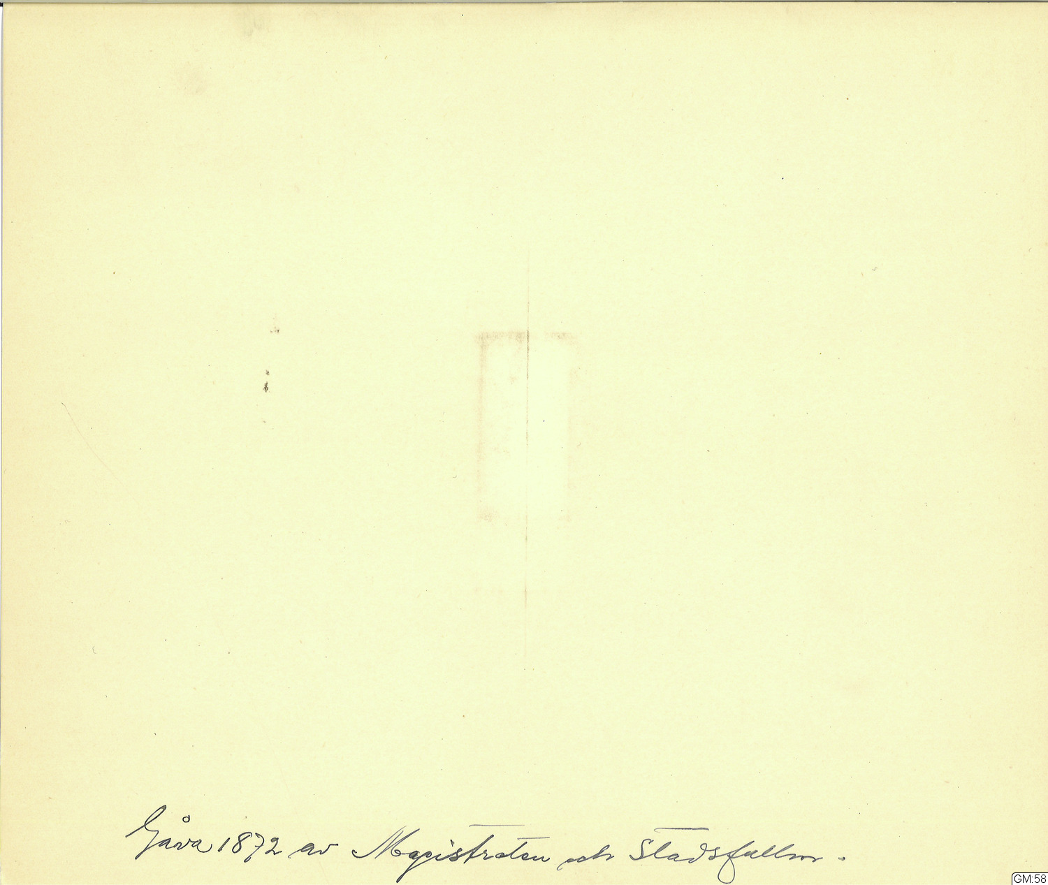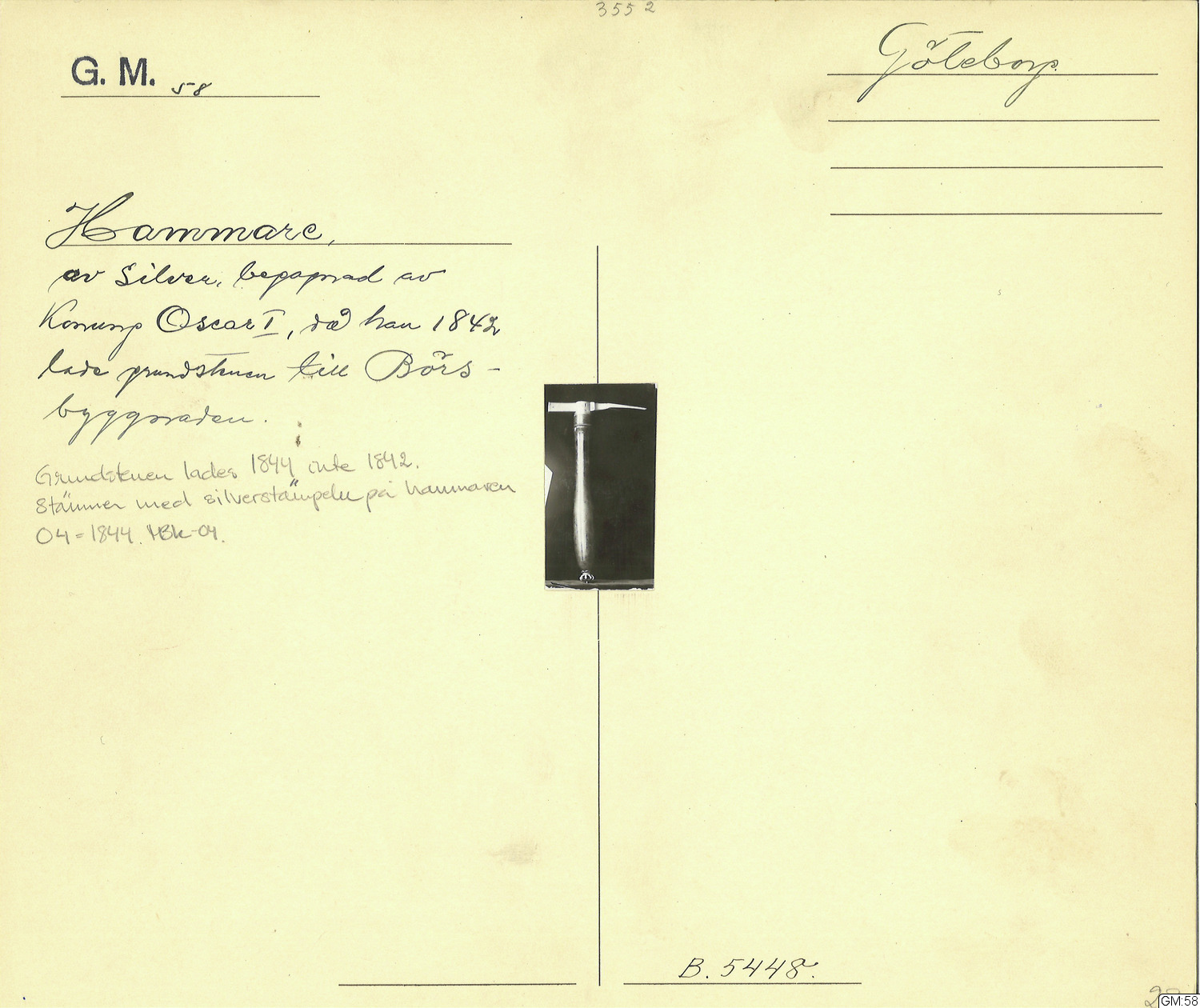 användes - tillsammans med hammaren GM:59 - av Oscar I då han den 1 juni 1844 lade grundstenen till Börsbyggnaden i Göteborg. Skänktes 1872 (?) av Magistraten och Stadsfullmäktige.