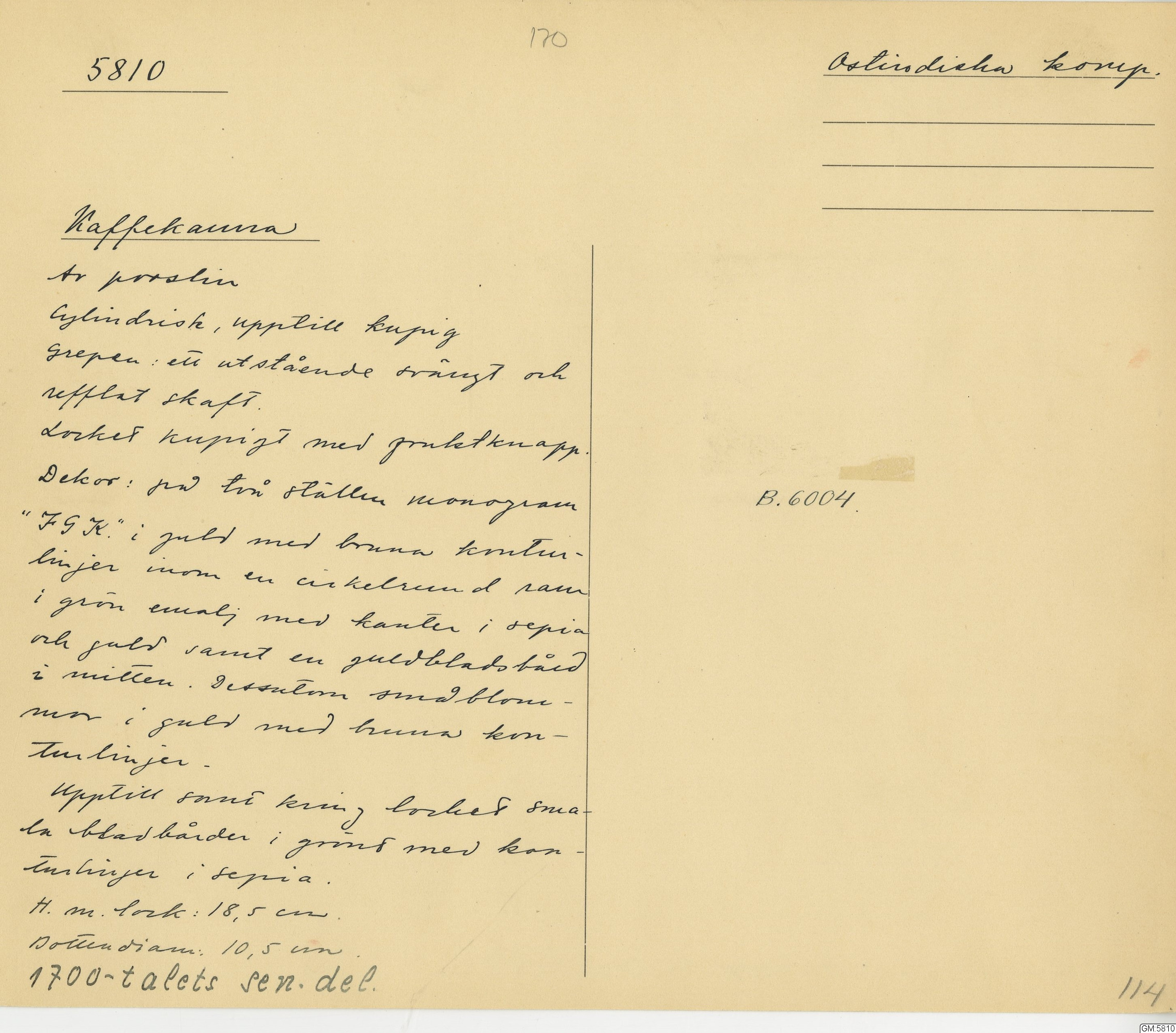 GM katalogkort 170. 18E. Porslin Ostindiskt 1. Thé mm 1. Kannor, koppar, fat