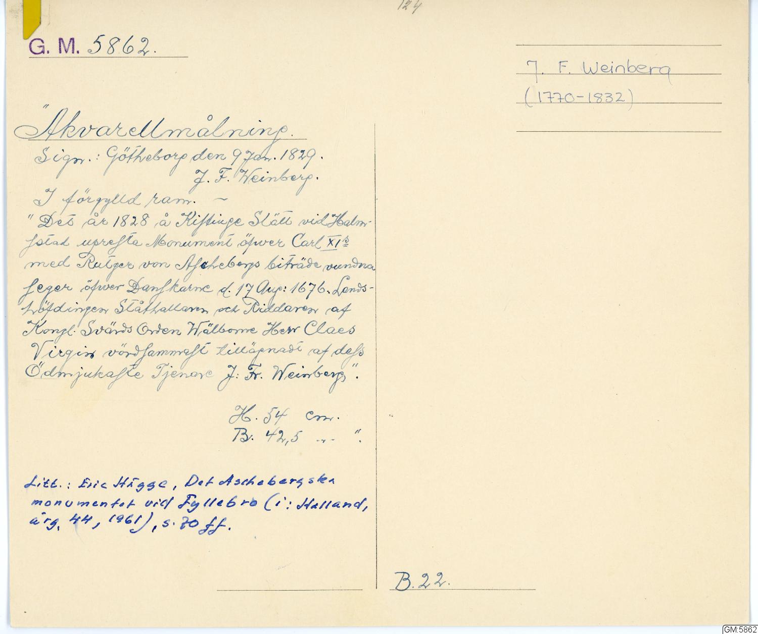 Det år 1828 å Kistinge Slätt vid Halmstad upresta Monument öfver Carl XI:s med Rutger von Aschebergs biträde vundne seger öfver Danskarne d. 17 Aug 1676. Landshöfdingen Ståthållaren och Riddaren af Kongl. Svärds Orden Wälborne Herr Claes Virgin vördsamast tillägnadt af dess ödmjukaste Tjenare J. Fr Weinberg.