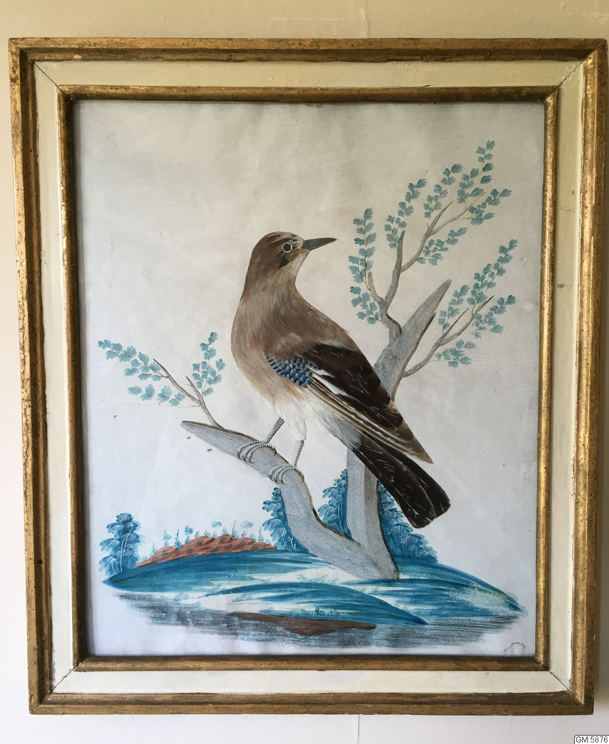 tavla, akvarell m nötskrika i naturfjädrar