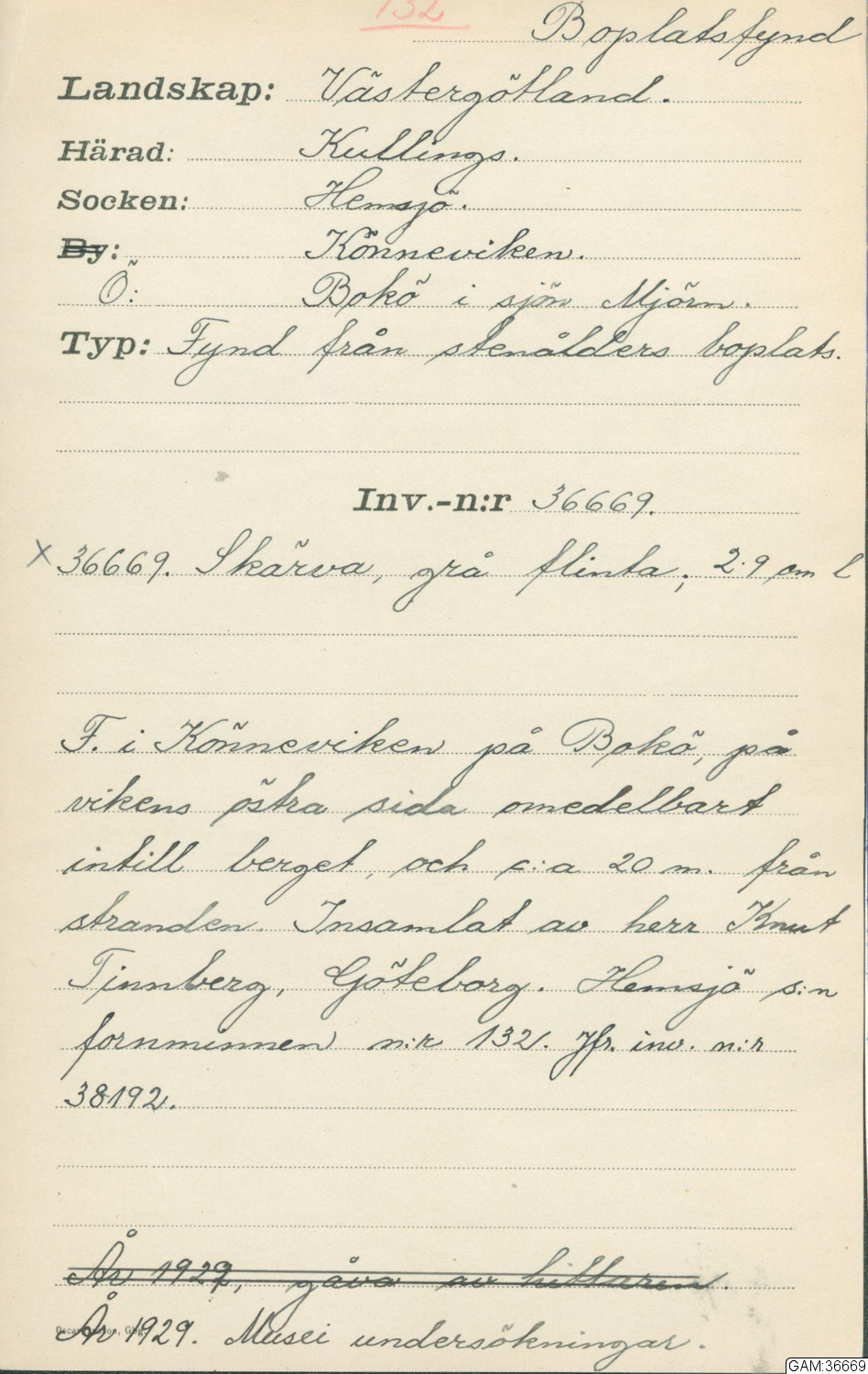 GAM katalogkort : V B : Västergötland : Kullings härad : Stenåldern : Boplatser