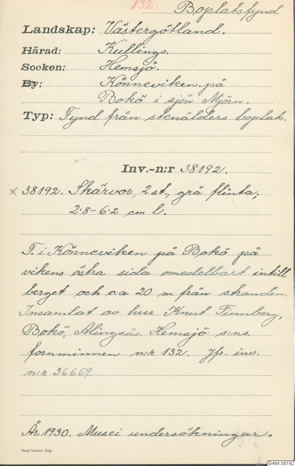 GAM katalogkort : V B : Västergötland : Kullings härad : Stenåldern : Boplatser