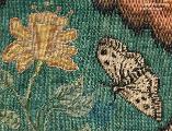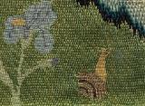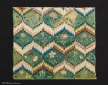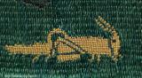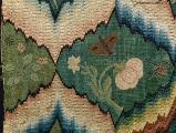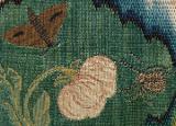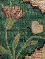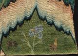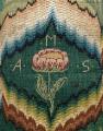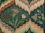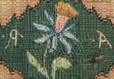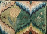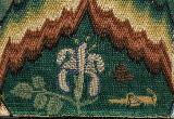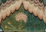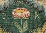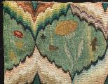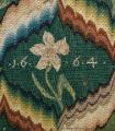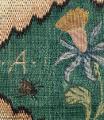 - Broderi, silke sytt i petit-point, points d´Hongri på tuskaftat grovt linne. Insytt i korstygn A R A M S 1664. Botten grön i flera skiftningar, mönstret i flera färger.