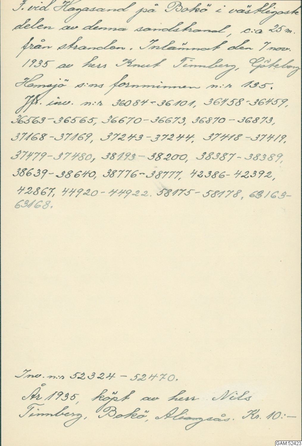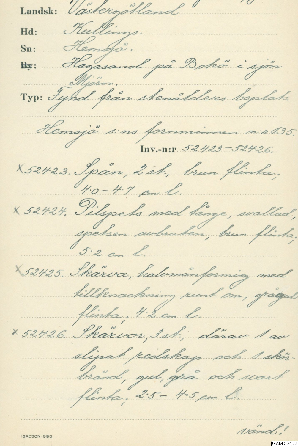 GAM katalogkort : V B : Västergötland : Kullings härad : Stenåldern : Boplatser