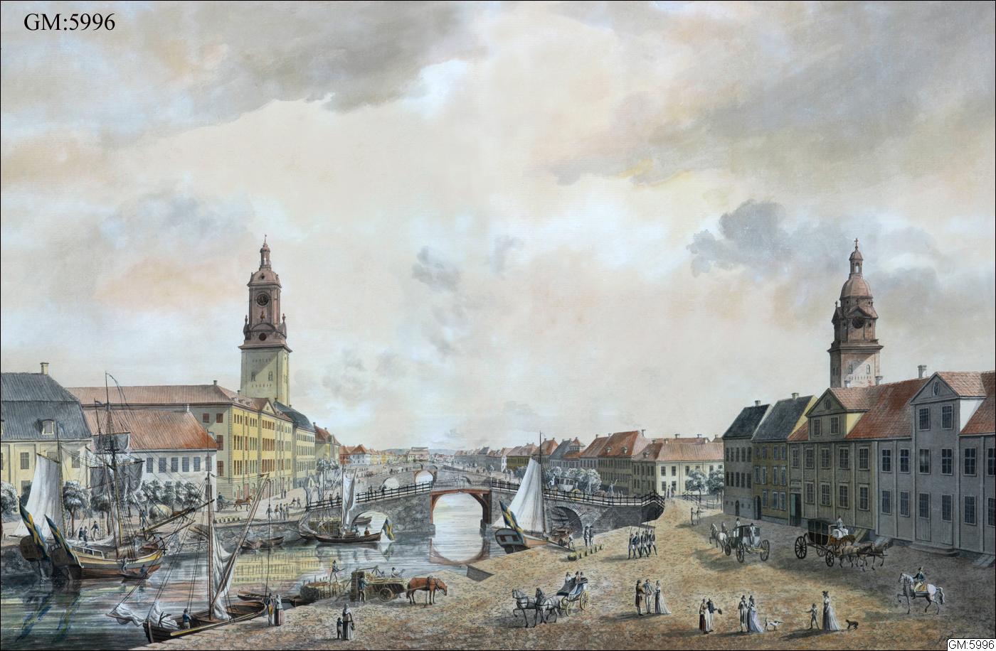 - Sträckningsbild med Stora Hamnkanalen omgiven av Norra och Södra Hamngatorna mot öster. Blick från Lilla Torget, med Kämpebron bron närmast i bild, där bortom Europabron (från 1883 kallad Tyska bron). Till höger syns Västra Hamnkanalen gå in. Till vänster, efter Kämpebron, ligger Svenska Ostindiska Compagniets byggnad.