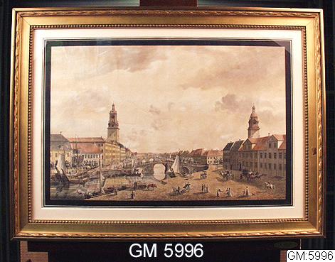 Sträckningsbild med Stora Hamnkanalen omgiven av Norra och Södra Hamngatorna mot öster. Blick från Lilla Torget, med Kämpebron bron närmast i bild, där bortom Europabron (från 1883 kallad Tyska bron). Till höger syns Västra Hamnkanalen gå in. Till vänster, efter Kämpebron, ligger Svenska Ostindiska Compagniets byggnad.