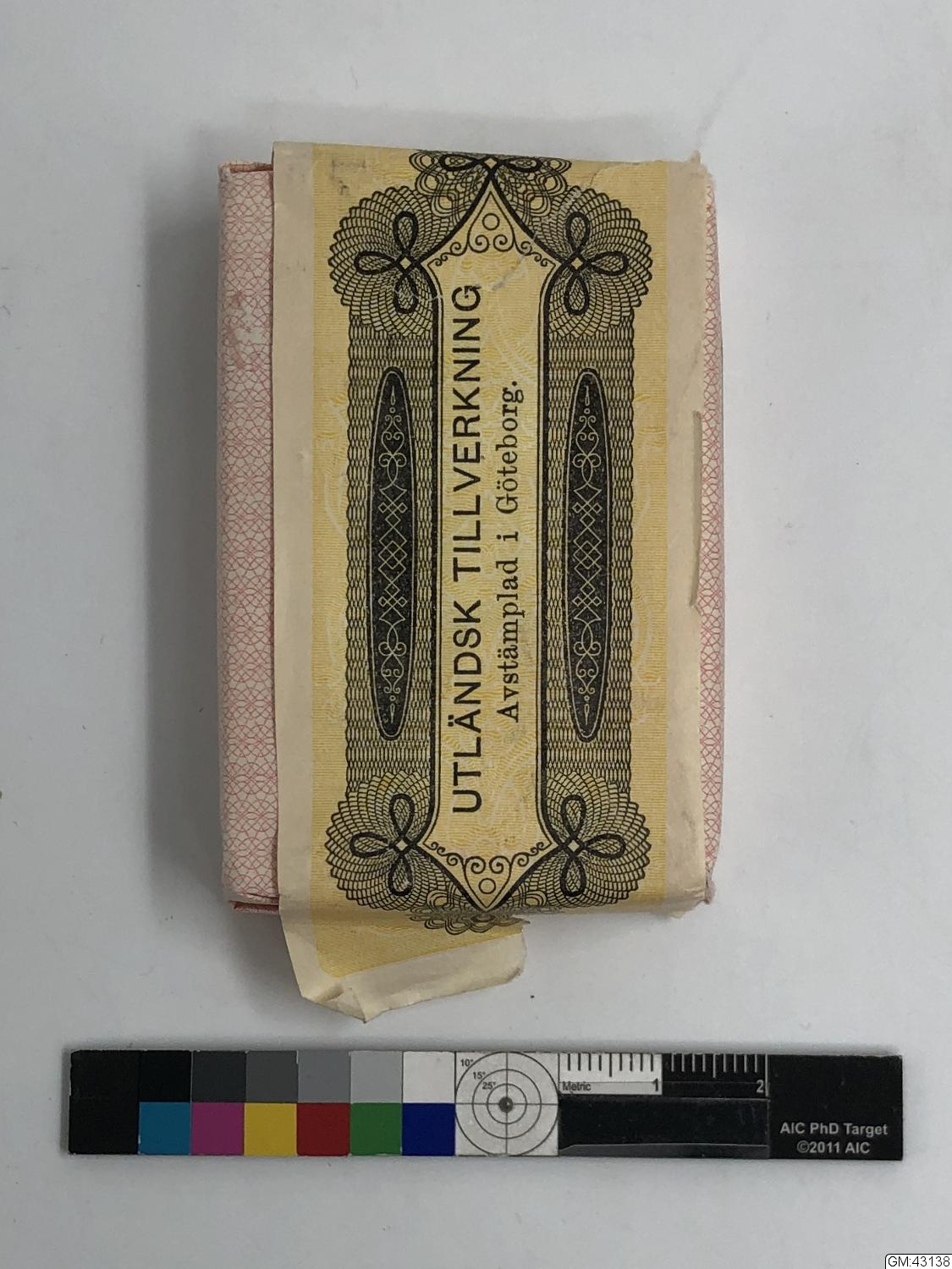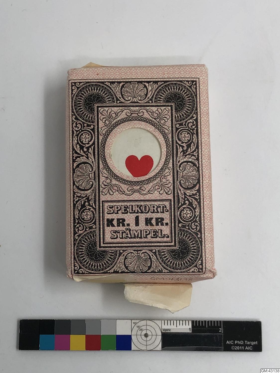 Spelkort i oöppnad förpackning 'Spelkort kr. 1 kr. stämpel'. Tryckt med 'Utländsk tillverkning, avstämplad i Göteborg'