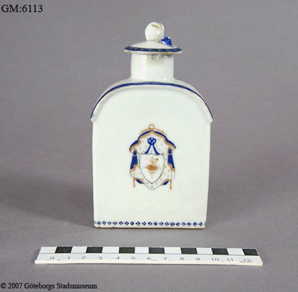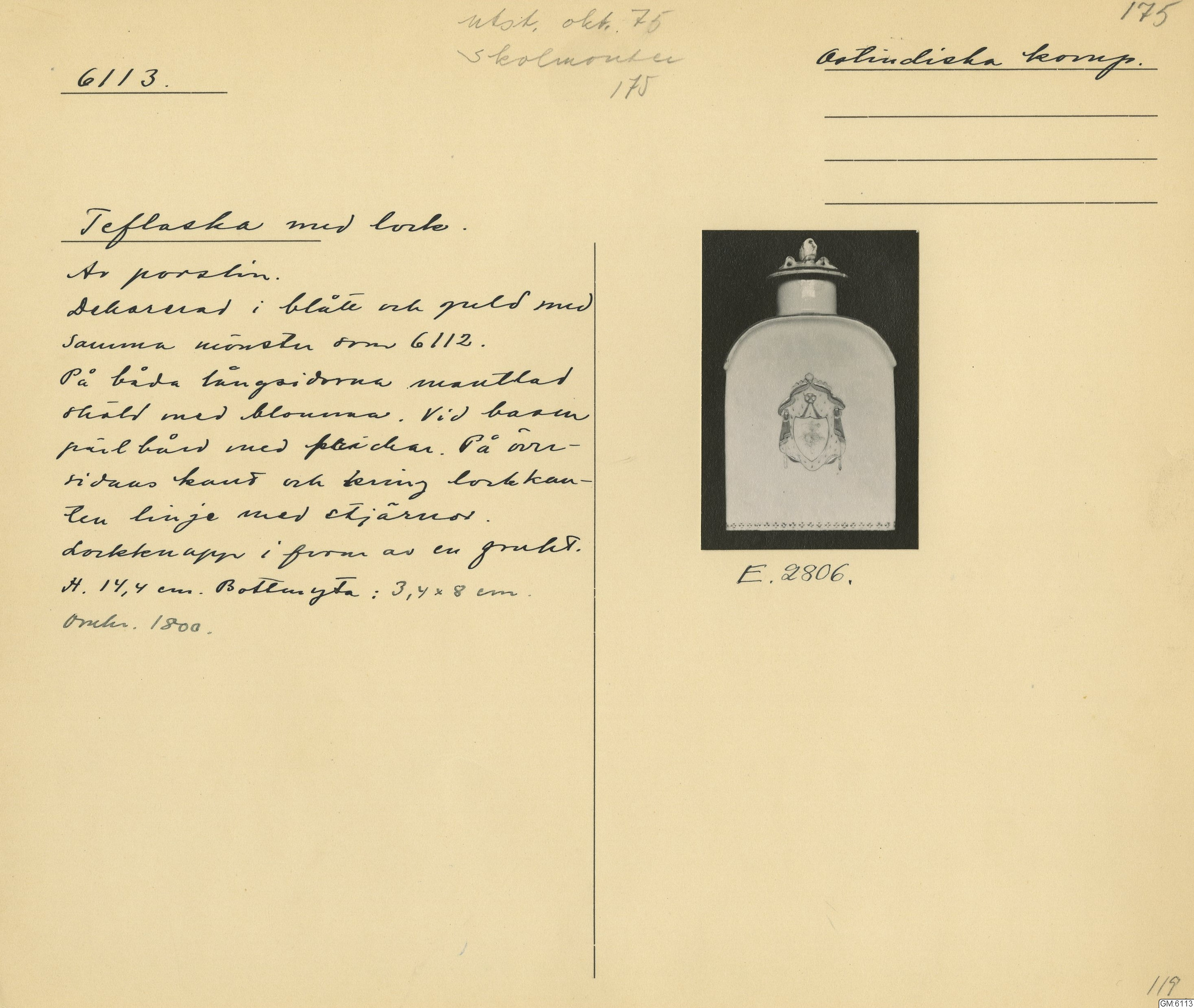 GM katalogkort 175. 18E Porslin Ostindiskt 5. Karott, terrin, muggar, skål mm