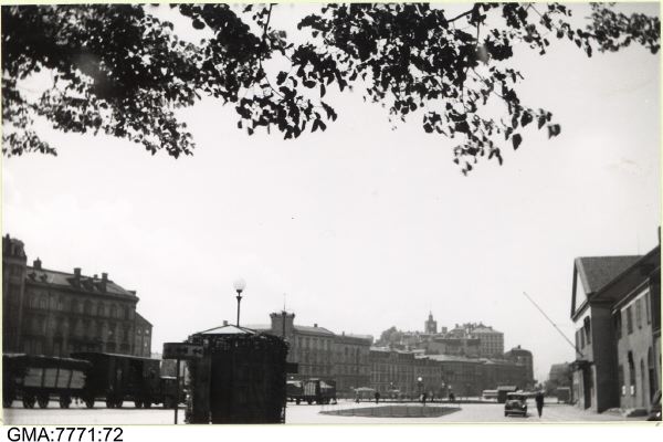 - Blick från norr över Lilla Bommens torg. T.h. Västgötabanans gamla stationshus. I fonden byggnader vid S:t Eriks torg m.fl., bl.a. Hasselbladska huset.