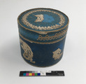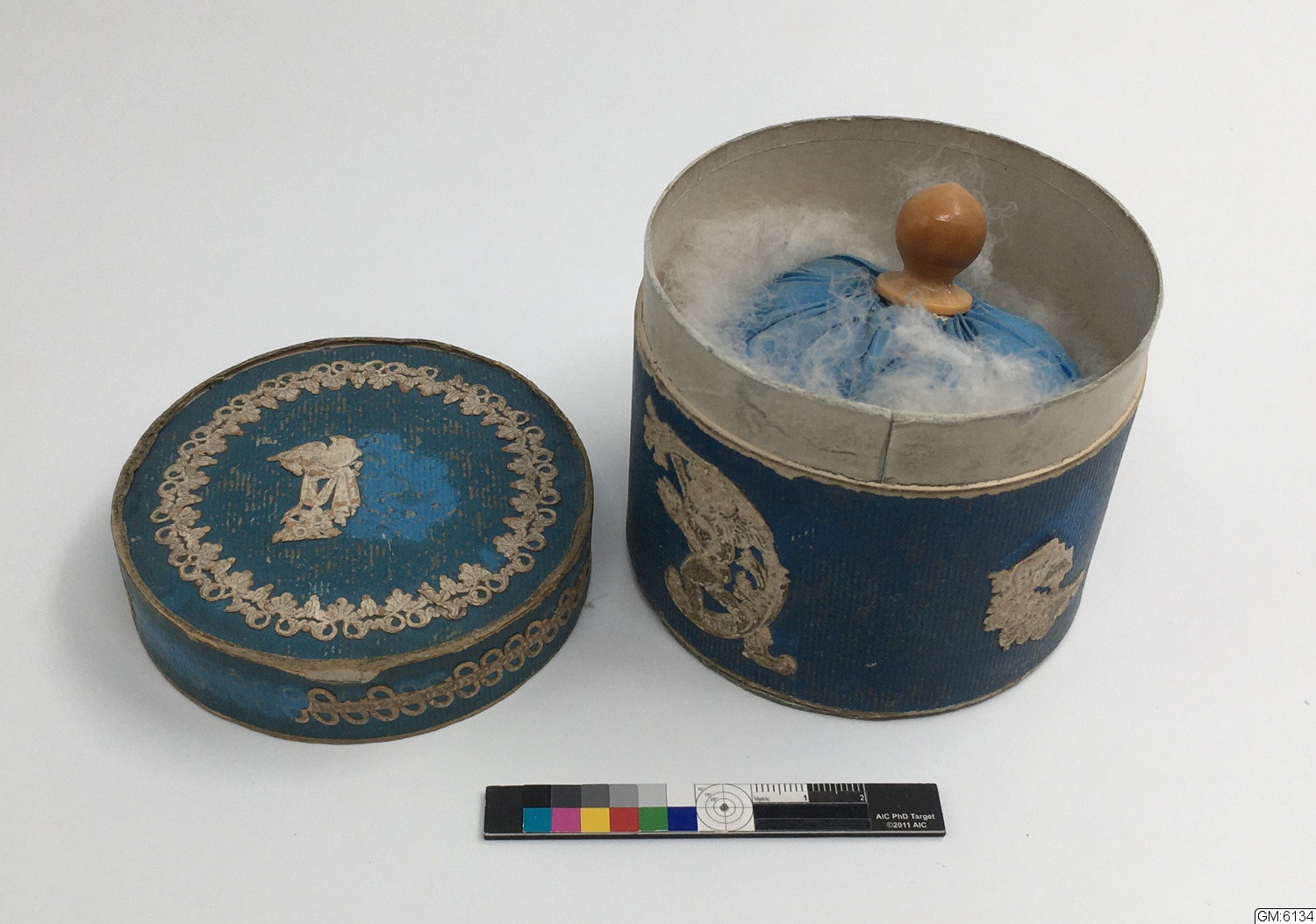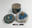 Rund puderdosa i papper med lock. Innehåller en pudervippa i dun.