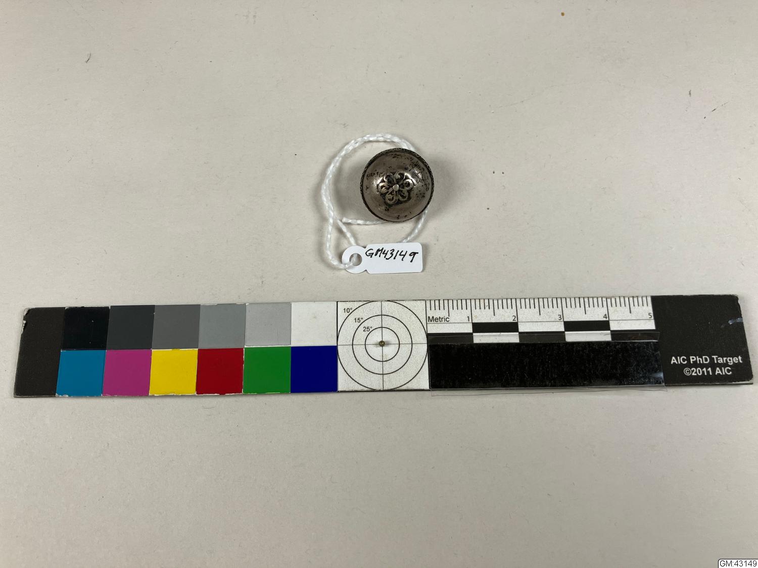 knapp av vitmetall ,möjligen silver, ihålig halvkupol med dekor av stiliserad blomma. troligen dräktsilver