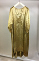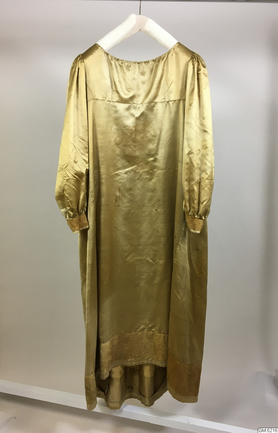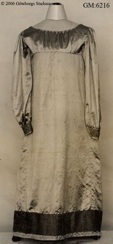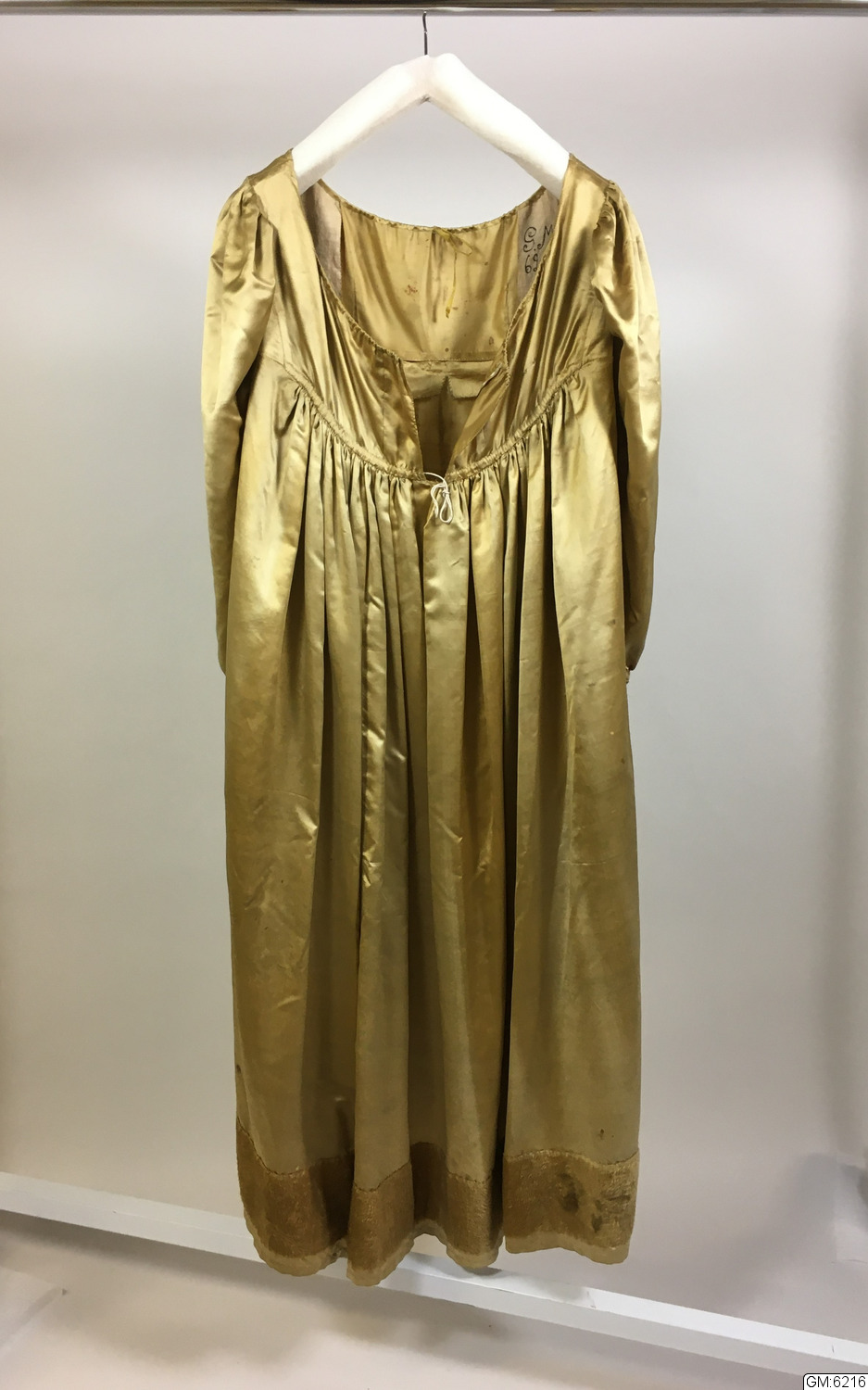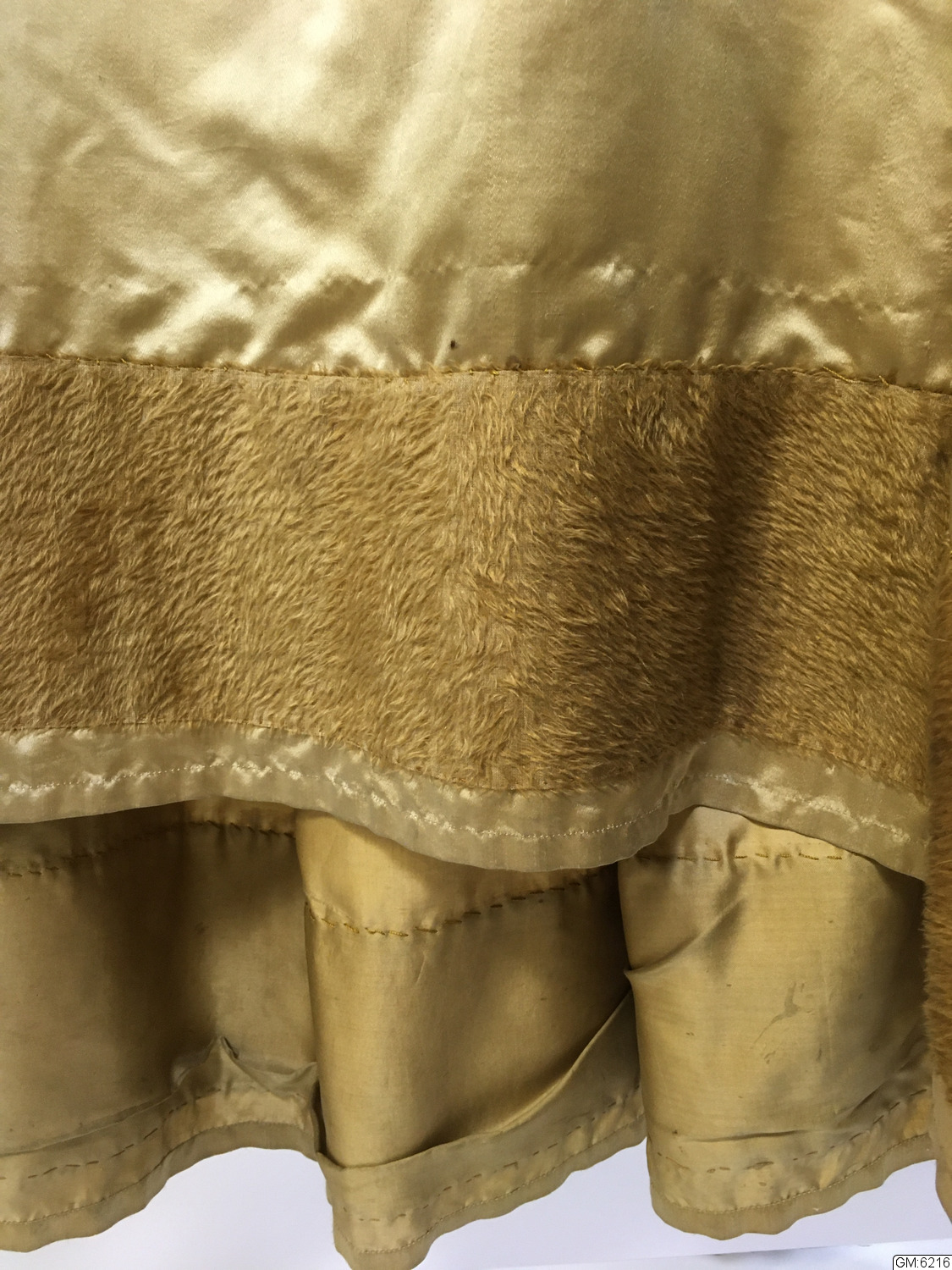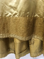Damdräkt av gulbrun atlas med bård av brun sammet.