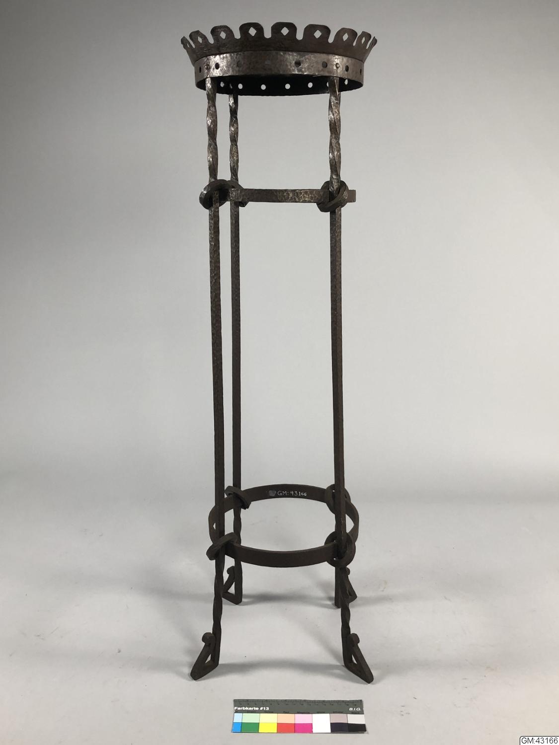 Piedestal i järn, rostig. Fyra ben, skiva med genombrutet krön, smidesarbete.