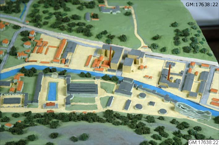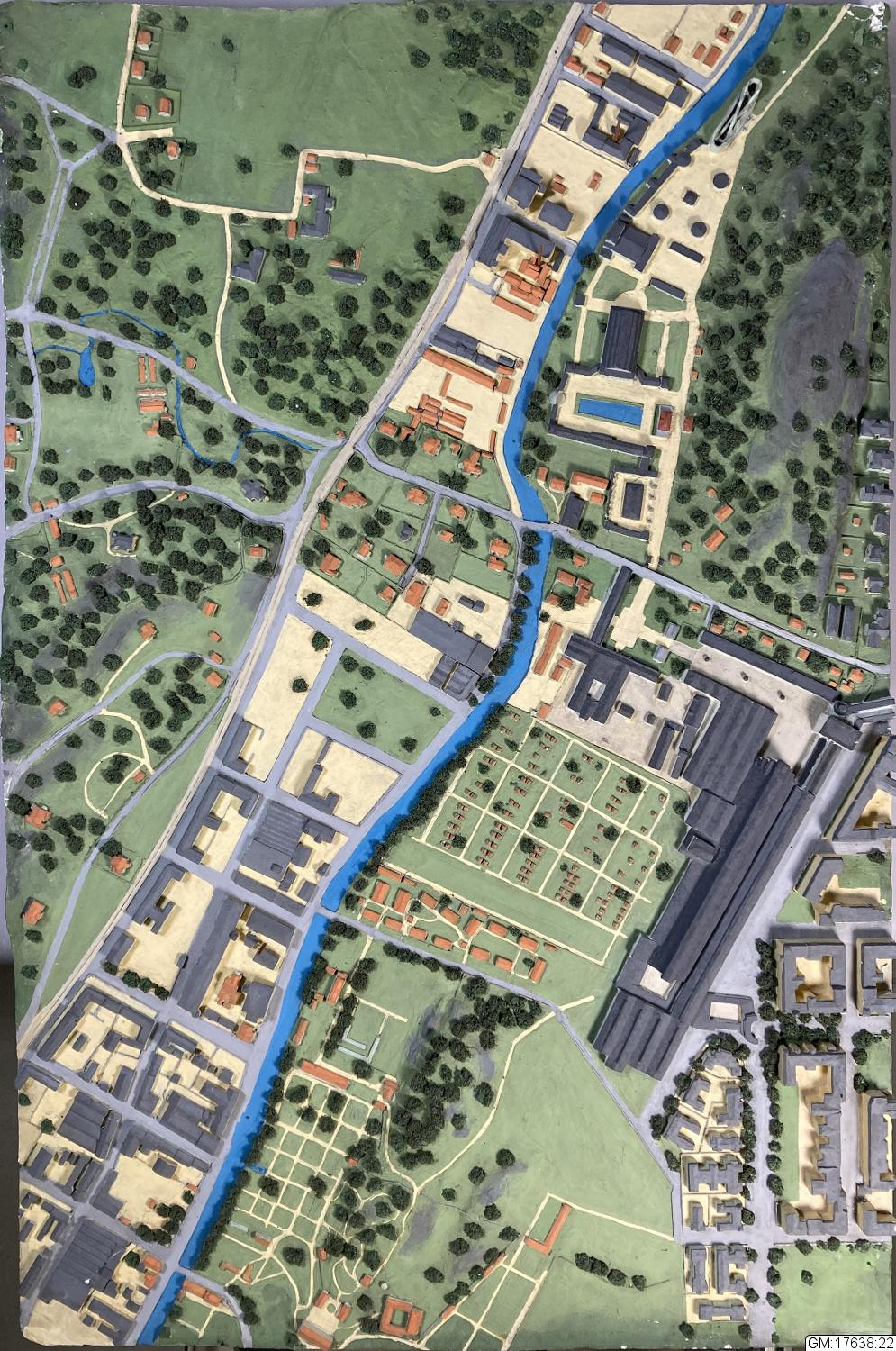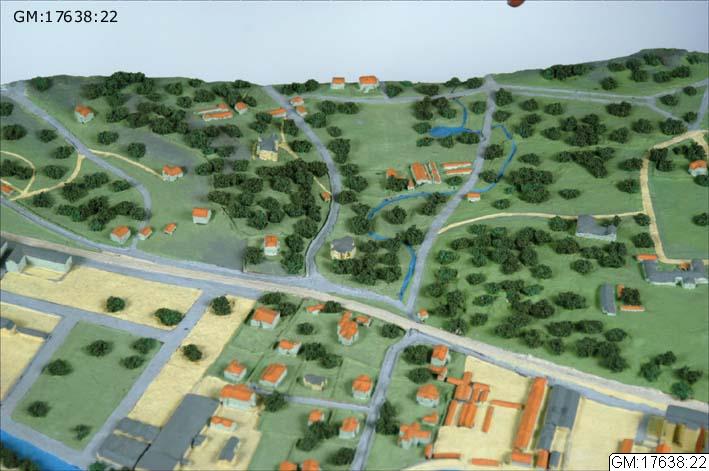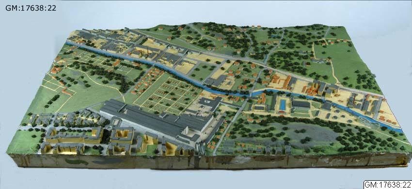 Del ur Göteborgsmodellen föreställande: Liseberg, Mölndalsån, Gårda och utställningshallarna (Svenska mässan)