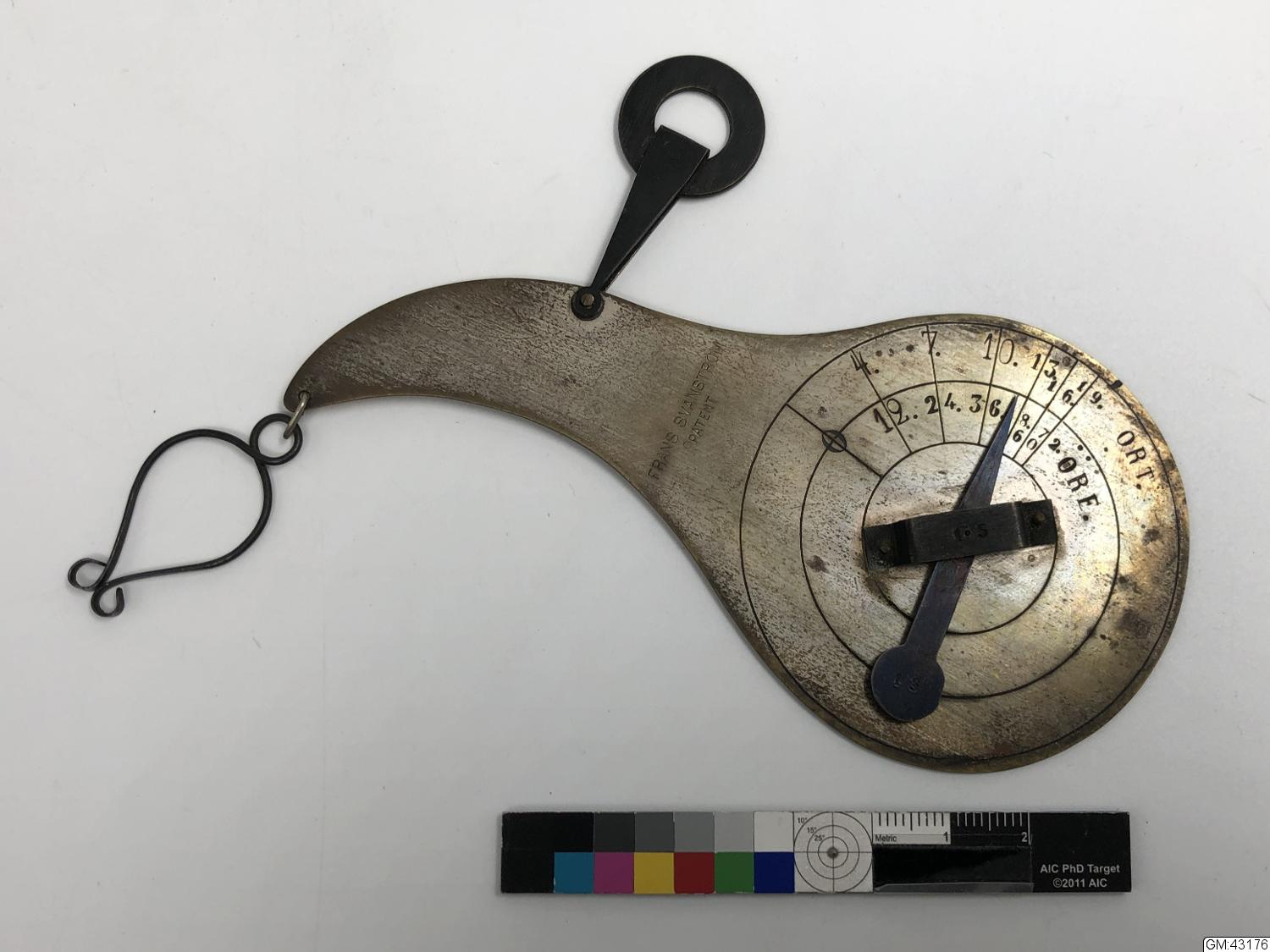 Brevvåg, Portativ handvrevvåg för lantbrevbärare. Föremål härrör till sig dels från hotellrörelsen och dels från Bark personligen.