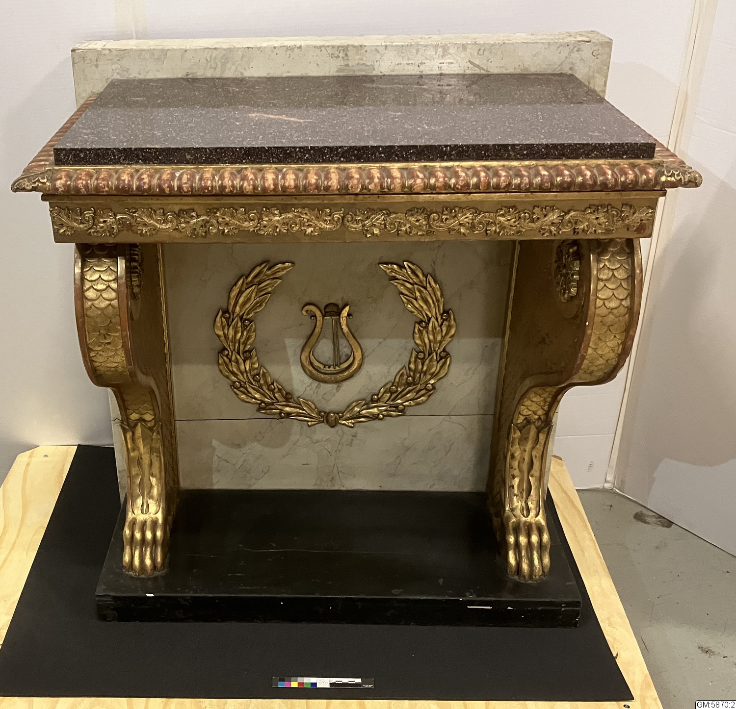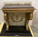 Konsolbord med spegel. Ådringsmålat bakstycke, svart sockel, sidostycken förgyllda, "tassar" med fjäll, förgylld sarg med stiliserade växtornament, marmorskiva.