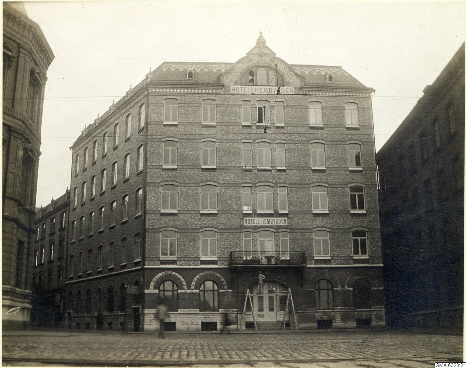 Hotell Hembygden vid Packhusplatsen, granne med posthuset som skymtartill vänster.