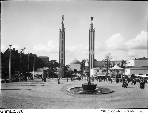 exteriör; sommar; dag; utställning; utställningsbyggnation; utställningsbesökare; arkitektur; torn; fontän; staty; kupol