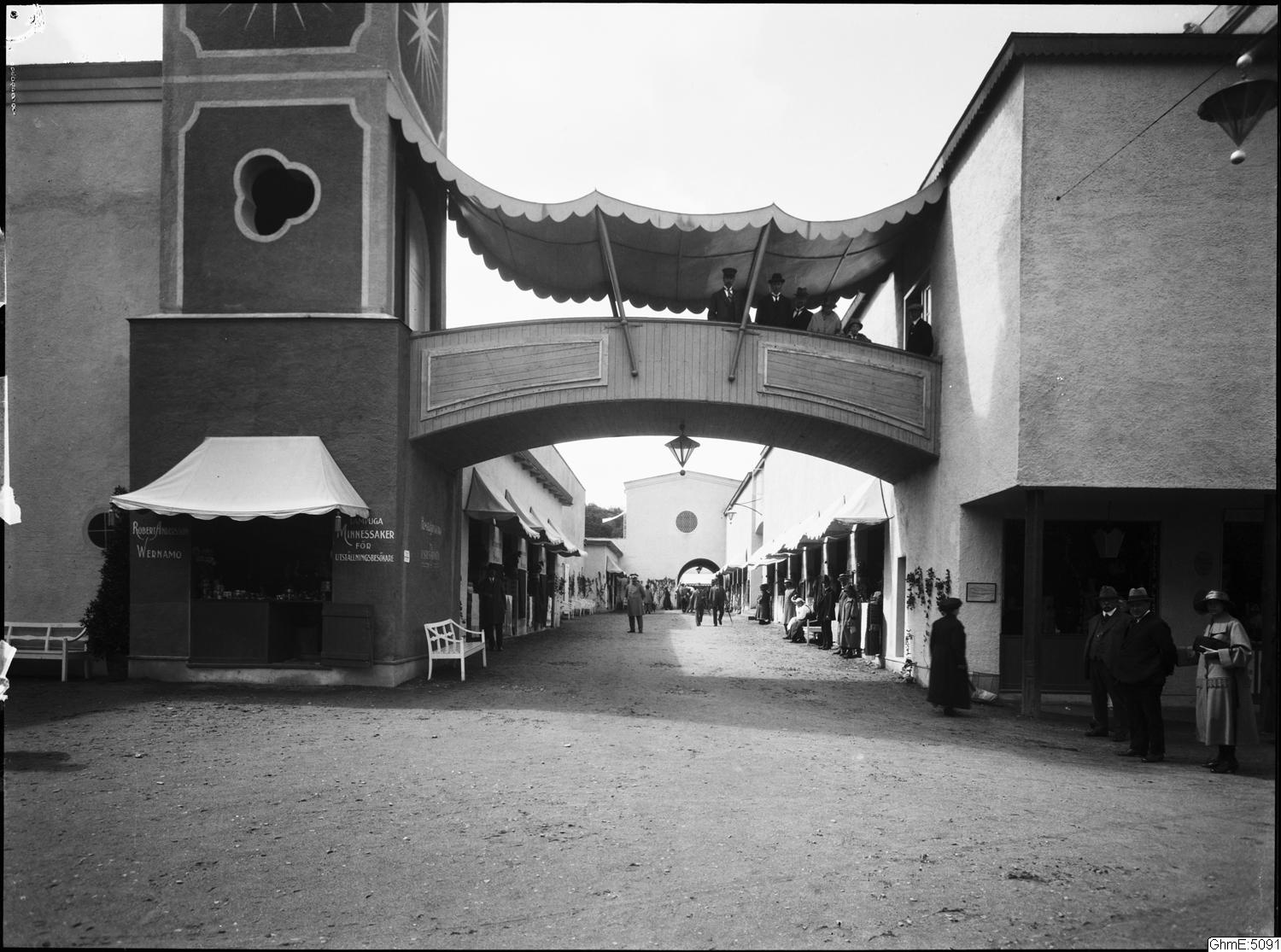 - Bild från utställningsområdet, vy längs Handelsgatan längs mot norr. Fotot taget vid Ostindiska tornet. I fonden kan man ana Stora Gården. Till höger Utlandsvenskarnas utställning, Jubileumsutställningen 1923.