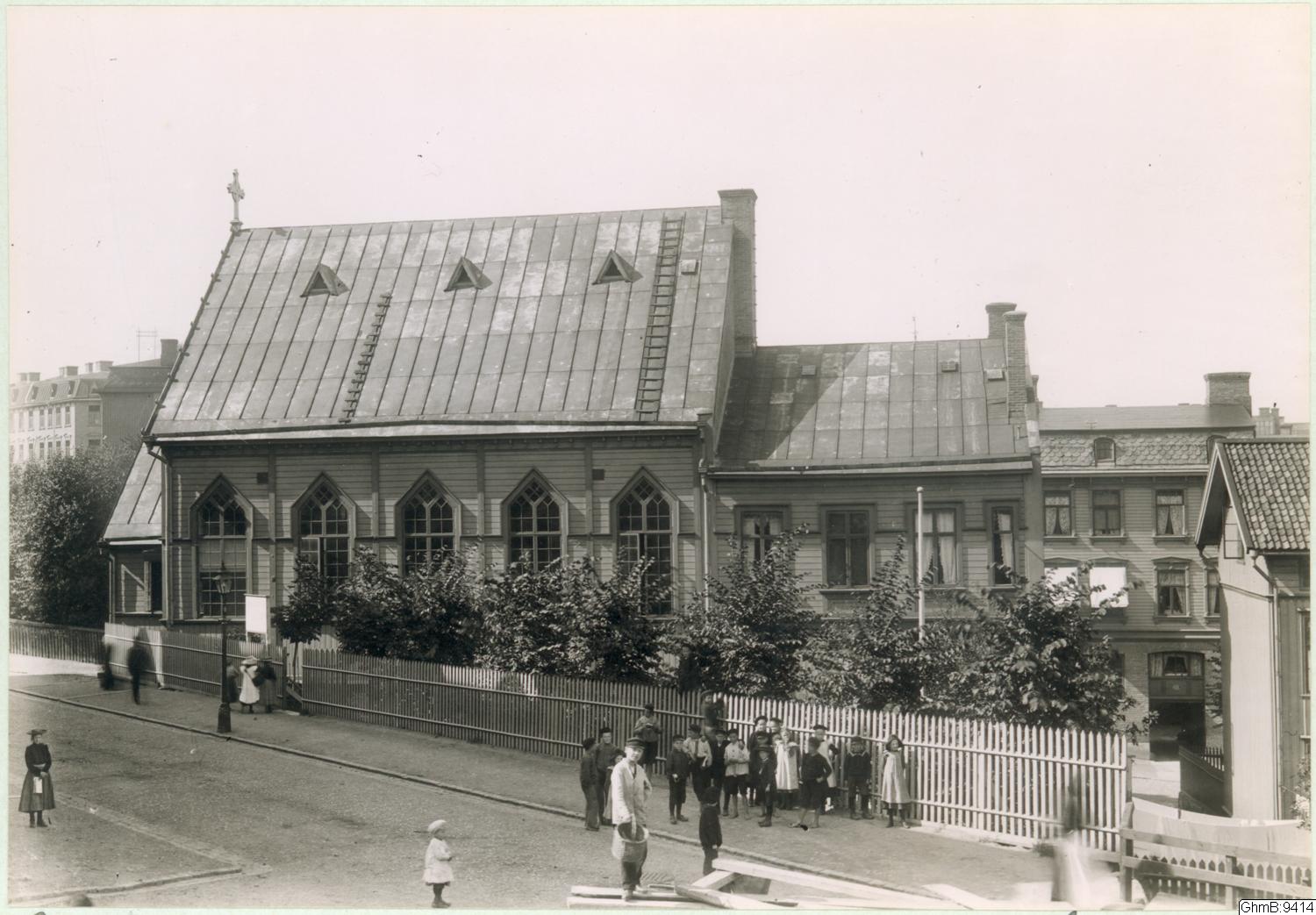 Oscar Fredriks församlingshydda vid hörnet av Fjällgatan 17/ Paradisgatan 14. I bakgrunden landshövdingehus vid Paradisgatan.