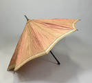 Paraply i ljusrött sidentyg med randning i blått längs ytterkanten. Stomme av metall och spröt av fiskben och handtag i utskuret mörkt trä i form av ett lejon. Doppsko, skaft och piggar av mässing, doppskon och skaftet med präglat mönster.