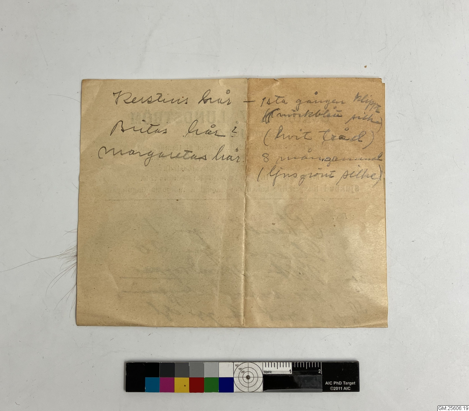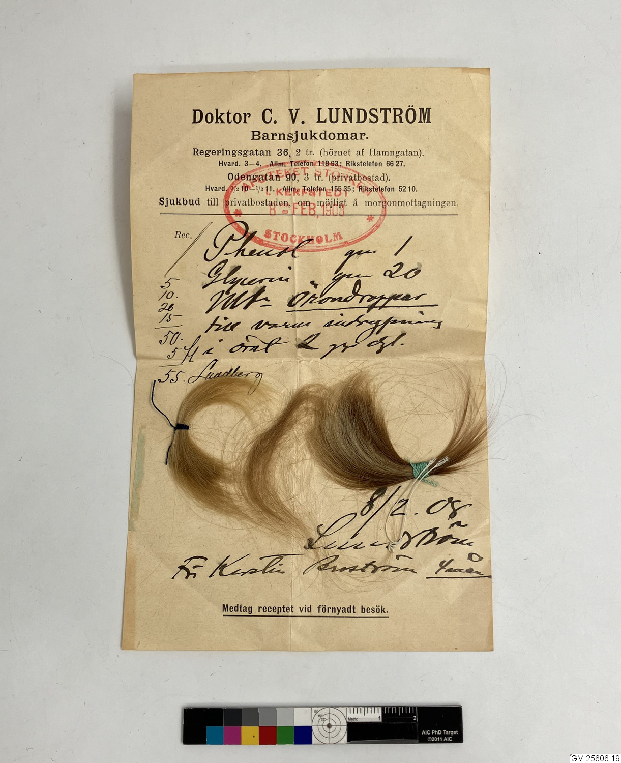 - Ett ihopvikt papper, som ursprungligen är ett receptkvitto från doktor C. V. Lundström, innehållande tre hårlockar omknutna med tunt snöre. På baksidan står "Kerstins hår, första gången klipp (mörkblått silke), Britas hår?, (hvit tråd), Margaretas hår, 8 mån gammal (ljusgrönt silke).
