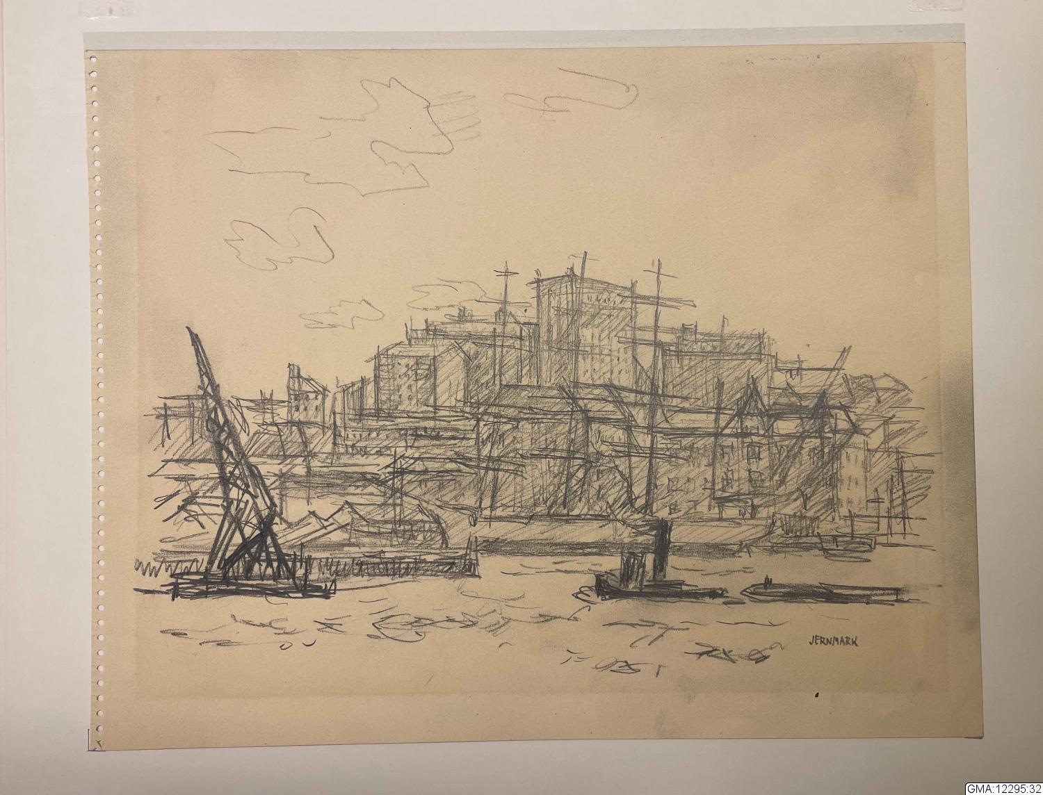 - Vy med Göta Älv och Otterhällan. På älven går en bogserbåt med pråm på släp. Vid kaj ligger ett segelfartyg. I bakgrunden Skeppsbron och skyskrapan Otterhall.